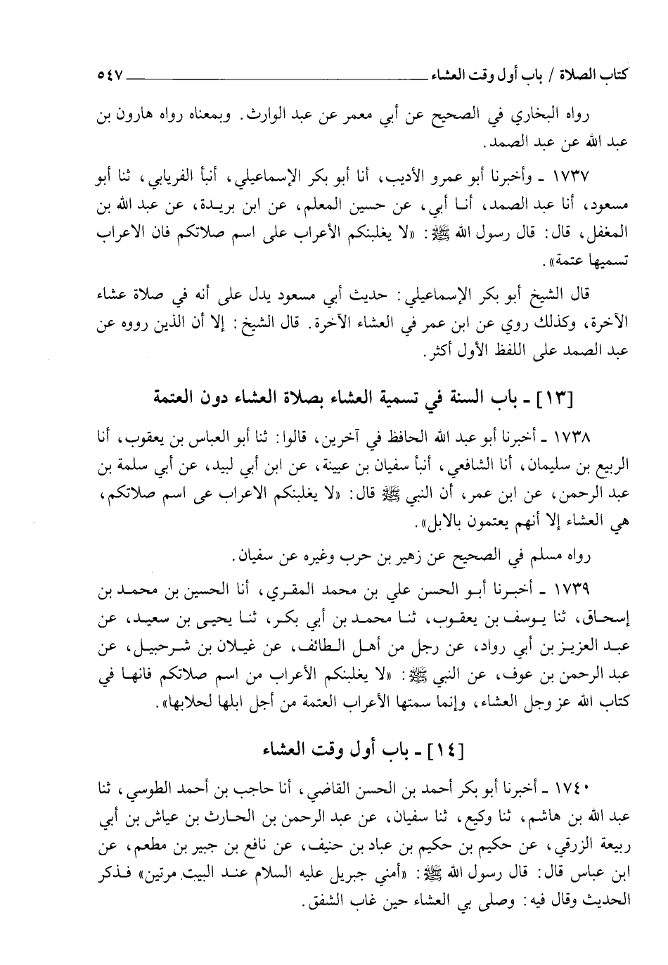 1737 - وَأَخْبَرَنَا أَبُو عَمْرٍو الْأَدِيبُ، أنا أَبُو بَكْرٍ الْإِسْمَاعِيلِيُّ، أنبأ الْفِرْيَابِيُّ ثنا أَبُو مَسْعُودٍ، أنا عَبْدُ الصَّمَدِ، أنا أَبِي عَنْ حُسَيْنٍ الْمُعَلِّمِ، عَنِ ابْنِ بُرَيْدَةَ عَنْ عَبْدِ اللهِ بْنِ الْمُغَفَّلِ، قَالَ: قَالَ رَسُولُ اللهِ صَلَّى اللهُ عَلَيْهِ وَسَلَّمَ: §" لَا يَغْلِبَنَّكُمُ الْأَعْرَابُ عَلَى اسْمِ صَلَاتِكُمْ فَإِنَّ الْأَعْرَابَ تُسَمِّيهَا عَتَمَةً " قَالَ الشَّيْخُ أَبُو بَكْرٍ الْإِسْمَاعِيلِيُّ: حَدِيثُ أَبِي مَسْعُودٍ يَدُلُّ عَلَى أَنَّهُ فِي صَلَاةِ عِشَاءِ الْآخِرَةِ وَكَذَلِكَ رُوِيَ عَنِ ابْنِ عُمَرَ فِي الْعِشَاءِ الْآخِرَةِقَالَ الشَّيْخُ: إِلَّا أَنَّ الَّذِينَ رَوَوْهُ عَنْ عَبْدِ الصَّمَدِ عَلَى اللَّفْظِ الْأَوَّلِ أَكْثَرُ
