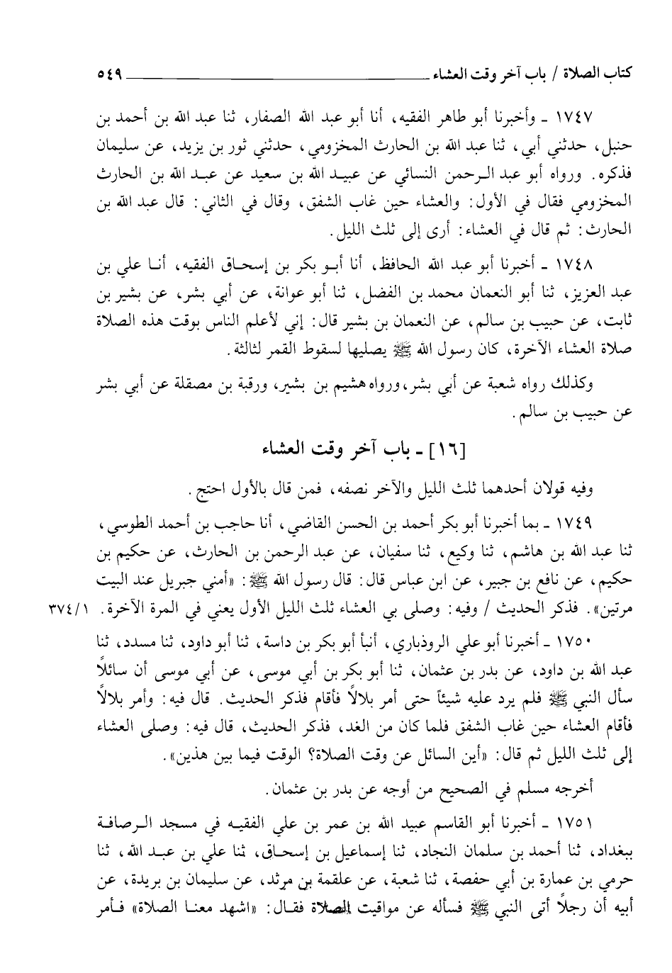 1747 - وَأَخْبَرَنَا أَبُو طَاهِرٍ الْفَقِيهُ، أنا أَبُو عَبْدِ اللهِ الصَّفَّارُ ثنا عَبْدُ اللهِ بْنُ أَحْمَدَ بْنِ حَنْبَلٍ، حَدَّثَنِي أَبِي ثنا عَبْدُ اللهِ بْنُ الْحَارِثِ الْمَخْزُومِيُّ، حَدَّثَنِي ثَوْرُ بْنُ يَزِيدَ عَنْ سُلَيْمَانَ، فَذَكَرَهُ وَرَوَاهُ أَبُو عَبْدِ الرَّحْمَنِ النَّسَائِيُّ، عَنْ عُبَيْدِ اللهِ بْنِ سَعِيدٍ عَنْ عَبْدِ اللهِ بْنِ الْحَارِثِ الْمَخْزُومِيِّ، فَقَالَ فِي الْأَوَّلِ: " §وَالْعِشَاءَ حِينَ غَابَ الشَّفَقُ وَقَالَ فِي الثَّانِي: قَالَ عَبْدُ اللهِ بْنُ الْحَارِثِ ثُمَّ قَالَ فِي الْعِشَاءِ: أَرَى إِلَى ثُلُثِ اللَّيْلِ "