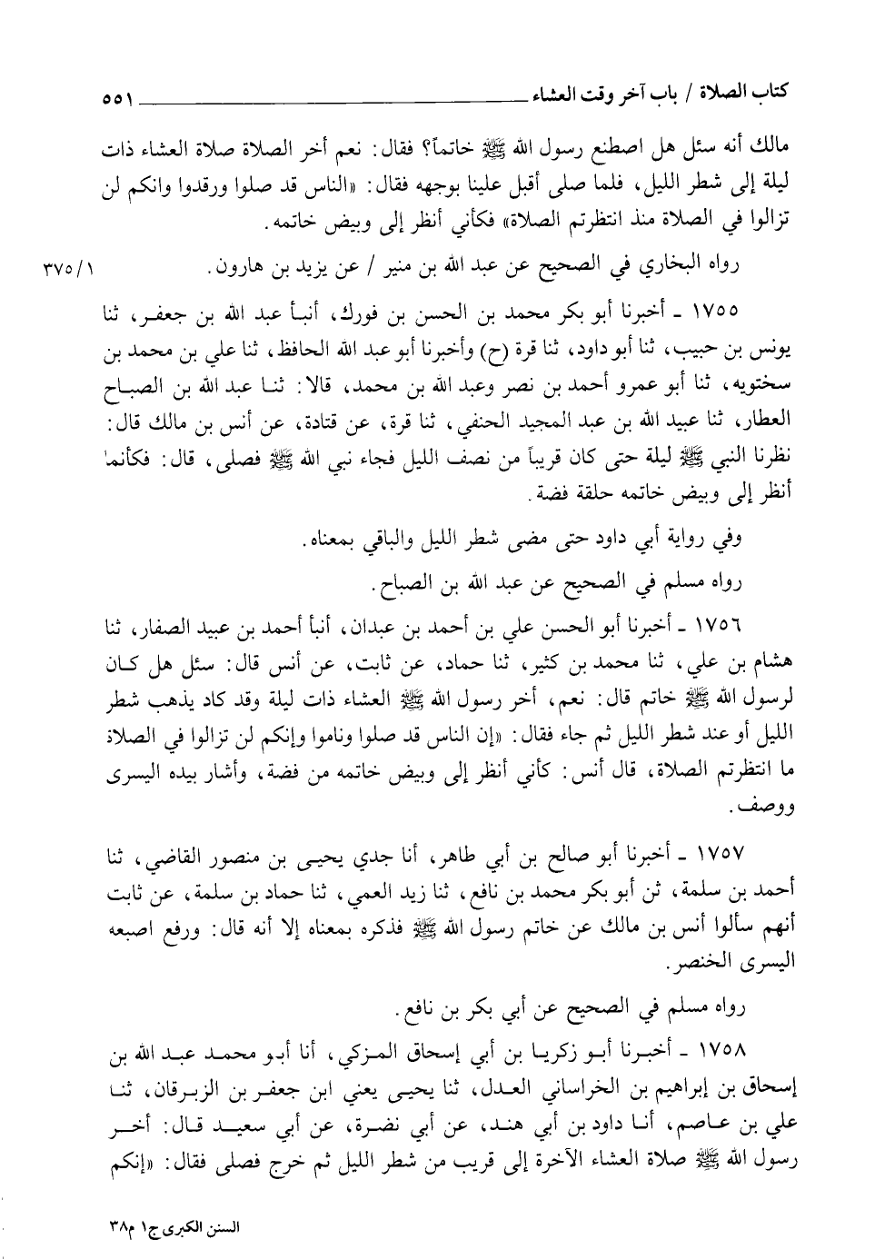 1755 - أَخْبَرَنَا أَبُو بَكْرٍ مُحَمَّدُ بْنُ الْحَسَنِ بْنِ فُورَكٍ أنبأ عَبْدُ اللهِ بْنُ جَعْفَرٍ ثنا يُونُسُ بْنُ حَبِيبٍ ثنا أَبُو دَاوُدَ ثنا قُرَّةُ، ح. وَأَخْبَرَنَا أَبُو عَبْدِ اللهِ الْحَافِظُ ثنا عَلِيُّ بْنُ مُحَمَّدِ بْنِ سَخْتَوَيْهِ ثنا أَبُو عَمْرٍو أَحْمَدُ بْنُ نَصْرٍ وَعَبْدُ اللهِ بْنُ مُحَمَّدٍ قَالَا: ثنا عَبْدُ اللهِ بْنُ الصَّبَّاحِ الْعَطَّارُ ثنا عُبَيْدُ اللهِ بْنُ عَبْدِ الْمَجِيدِ الْحَنَفِيُّ ثنا قُرَّةُ عَنْ قَتَادَةَ عَنْ أَنَسِ بْنِ مَالِكٍ، قَالَ: §" نَظَرْنَا النَّبِيَّ صَلَّى اللهُ عَلَيْهِ وَسَلَّمَ لَيْلَةً حَتَّى كَانَ قَرِيبًا مِنْ نِصْفِ اللَّيْلِ فَجَاءَ نَبِيُّ اللهِ صَلَّى اللهُ عَلَيْهِ وَسَلَّمَ فَصَلَّى قَالَ: فَكَأَنَّمَا أَنْظُرُ إِلَى وَبِيضِ خَاتَمِهِ حَلْقَةُ فِضَّةٍ " وَفِي رِوَايَةِ أَبِي دَاوُدَ حَتَّى مَضَى شَطْرُ اللَّيْلِ وَالْبَاقِي بِمَعْنَاهُ رَوَاهُ مُسْلِمٌ فِي الصَّحِيحِ، عَنْ عَبْدِ اللهِ بْنِ الصَّبَّاحِ