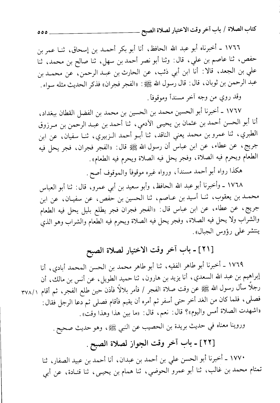 1766 - أَخْبَرَنَاهُ أَبُو عَبْدِ اللهِ الْحَافِظُ، أنا أَبُو بَكْرٍ أَحْمَدُ بْنُ إِسْحَاقَ، ثنا عُمَرُ بْنُ حَفْصٍ ثنا عَاصِمُ بْنُ عَلِيٍّ، قَالَ: وَثنا أَبُو نَصْرٍ أَحْمَدُ بْنُ سَهْلٍ ثنا صَالِحُ بْنُ مُحَمَّدٍ ثنا عَلِيُّ بْنُ الْجَعْدِ، قَالَا: أنا ابْنُ أَبِي ذِئْبٍ، عَنِ الْحَارِثِ بْنِ عَبْدِ الرَّحْمَنِ عَنْ مُحَمَّدِ بْنِ عَبْدِ الرَّحْمَنِ بْنِ ثَوْبَانَ، قَالَ: قَالَ رَسُولُ اللهِ صَلَّى اللهُ عَلَيْهِ وَسَلَّمَ: §" الْفَجْرُ فَجْرَانِ " فَذَكَرَ الْحَدِيثَ مِثْلَهُ سَوَاءٌ وَقَدْ رُوِيَ مِنْ وَجْهٍ آخَرَ مُسْنَدًا وَمَوْقُوفًا