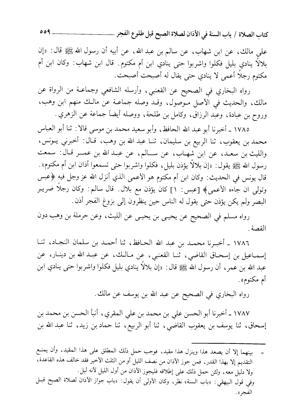 1786 - أَخْبَرَنَا مُحَمَّدُ بْنُ عَبْدِ اللهِ الْحَافِظُ ثنا أَحْمَدُ بْنُ سَلْمَانَ النَّجَّادُ ثنا إِسْمَاعِيلُ بْنُ إِسْحَاقَ الْقَاضِي ثنا الْقَعْنَبِيُّ عَنْ مَالِكٍ عَنْ عَبْدِ اللهِ بْنِ دِينَارٍ، عَنْ عَبْدِ اللهِ بْنِ عُمَرَ، أَنَّ رَسُولَ اللهِ صَلَّى اللهُ عَلَيْهِ وَسَلَّمَ قَالَ: §" إِنَّ بِلَالًا يُنَادِي بِلَيْلٍ فَكُلُوا وَاشْرَبُوا حَتَّى يُنَادِيَ ابْنُ أُمِّ مَكْتُومٍ رَوَاهُ الْبُخَارِيُّ فِي الصَّحِيحِ، عَنْ عَبْدِ اللهِ بْنِ يُوسُفَ، عَنْ مَالِكٍ