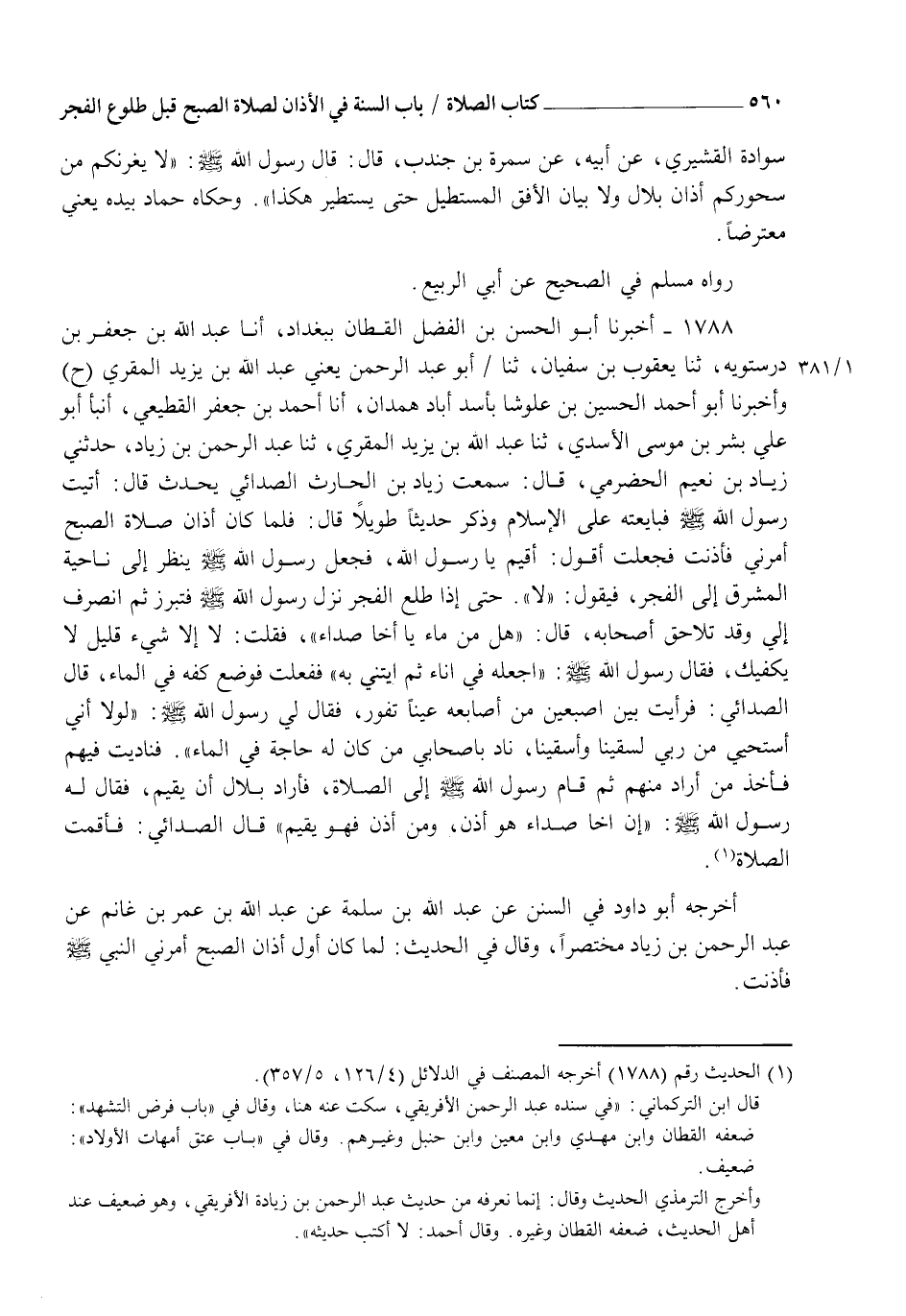 1788 - أَخْبَرَنَا أَبُو الْحُسَيْنِ بْنُ الْفَضْلِ الْقَطَّانُ بِبَغْدَادَ أنا عَبْدُ اللهِ بْنُ جَعْفَرِ بْنِ دُرُسْتُوَيْهِ ثنا يَعْقُوبُ بْنُ سُفْيَانَ ثنا أَبُو عَبْدِ الرَّحْمَنِ يَعْنِي عَبْدَ اللهِ بْنَ يَزِيدَ الْمُقْرِئُ، ح. وَأَخْبَرَنَا أَبُو أَحْمَدَ الْحُسَيْنُ بْنُ عَلُّوشَا بِأَسْدَابَادَ هَمْدَانَ أنا أَحْمَدُ بْنُ جَعْفَرٍ الْقَطِيعِيُّ، أنبأ أَبُو عَلِيٍّ بِشْرُ بْنُ مُوسَى الْأَسَدِيُّ، ثنا عَبْدُ اللهِ بْنُ يَزِيدَ الْمُقْرِئُ ثنا عَبْدُ الرَّحْمَنِ بْنُ زِيَادٍ، حَدَّثَنِي زِيَادُ بْنُ نُعَيْمٍ الْحَضْرَمِيُّ، قَالَ: سَمِعْتُ زِيَادَ بْنَ الْحَارِثِ الصُّدَائِيُّ يُحَدِّثُ قَالَ: أَتَيْتُ رَسُولَ اللهِ صَلَّى اللهُ عَلَيْهِ وَسَلَّمَ فَبَايَعْتُهُ عَلَى الْإِسْلَامِ وَذَكَرَ حَدِيثًا طَوِيلًا قَالَ: فَلَمَّا كَانَ أَذَانُ صَلَاةِ الصُّبْحِ أَمَرَنِي فَأَذَّنْتُ فَجَعَلْتُ أَقُولُ: أُقِيمُ يَا رَسُولَ اللهِ صَلَّى اللهُ عَلَيْهِ وَسَلَّمَ؟ فَجَعَلَ رَسُولُ اللهِ صَلَّى اللهُ عَلَيْهِ وَسَلَّمَ يَنْظُرُ إِلَى نَاحِيَةِ الْمَشْرِقِ إِلَى الْفَجْرِ فَيَقُولُ: " لَا " حَتَّى إِذَا طَلَعَ الْفَجْرُ نَزَلَ رَسُولُ اللهِ صَلَّى اللهُ عَلَيْهِ وَسَلَّمَ فَتَبَرَّزَ ثُمَّ انْصَرَفَ إِلِيَّ وَقَدْ تَلَاحَقَ أَصْحَابُهُ قَالَ: " هَلْ مِنْ مَاءٍ يَا أَخَا صُدَاءٍ؟ " فَقُلْتُ: لَا إِلَّا شَيْءٌ قَلِيلٌ لَا يَكْفِيكَ فَقَالَ رَسُولُ اللهِ صَلَّى اللهُ عَلَيْهِ وَسَلَّمَ: " اجْعَلْهُ فِي إِنَاءٍ ثُمَّ ائْتِنِي بِهِ " فَفَعَلْتُ فَوَضَعَ كَفَّهُ فِي الْمَاءِ، قَالَ الصُّدَائِيُّ: فَرَأَيْتُ بَيْنَ أُصْبُعَيْنِ مِنْ أَصَابِعِهِ عَيْنًا تَفُورُ فَقَالَ لِي رَسُولُ اللهِ صَلَّى اللهُ عَلَيْهِ وَسَلَّمَ: §" لَوْلَا أَنِّي أَسْتَحْيِي مِنْ رَبِّي لَسَقَيْنَا وَأَسْقَيْنَا نَادِ بِأَصْحَابِي مَنْ كَانَ لَهُ حَاجَةٌ فِي الْمَاءِ " فَنَادَيْتُ فِيهِمْ فَأَخَذَ مَنْ أَرَادَ مِنْهُمْ ثُمَّ قَالَ رَسُولُ اللهِ صَلَّى اللهُ عَلَيْهِ وَسَلَّمَ: " إِلَى الصَّلَاةِ " فَأَرَادَ بِلَالٌ أَنْ يُقِيمَ فَقَالَ لَهُ رَسُولُ اللهِ صَلَّى اللهُ عَلَيْهِ وَسَلَّمَ: " إِنَّ أَخَا صُدَاءٍ هُوَ أَذَّنَ وَمَنْ أَذَّنَ فَهُوَ يُقِيمُ " قَالَ الصُّدَائِيُّ: فَأَقَمْتُ الصَّلَاةَ أَخْرَجَهُ أَبُو دَاوُدَ فِي السُّنَنِ، عَنْ عَبْدِ اللهِ بْنِ سَلَمَةَ، عَنْ عَبْدِ اللهِ بْنِ عُمَرَ بْنِ غَانِمٍ، عَنْ عَبْدِ الرَّحْمَنِ بْنِ زِيَادٍ مُخْتَصَرًا وَقَالَ فِي الْحَدِيثِ: لَمَّا كَانَ أَوَّلُ أَذَانِ الصُّبْحِ أَمَرَنِي النَّبِيُّ صَلَّى اللهُ عَلَيْهِ وَسَلَّمَ فَأَذَّنْتُ