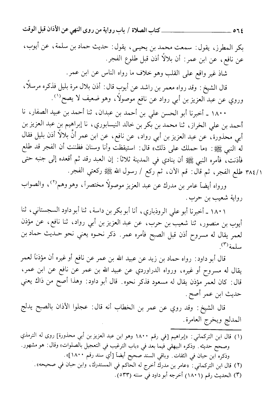1800 - أَخْبَرَنَا أَبُو الْحَسَنِ عَلِيُّ بْنُ أَحْمَدَ بْنِ عَبْدَانَ، ثنا أَحْمَدُ بْنُ عُبَيْدٍ الصَّفَّارُ، نا أَحْمَدُ بْنُ عَلِيٍّ الْخَرَّازُ ثنا مُحَمَّدُ بْنُ بَكْرِ بْنِ خَالِدٍ النَّيْسَابُورِيُّ، نا إِبْرَاهِيمُ بْنُ عَبْدِ الْعَزِيزِ بْنِ أَبِي مَحْذُورَةَ عَنْ عَبْدِ الْعَزِيزِ بْنِ أَبِي رَوَّادٍ عَنْ نَافِعٍ، عَنِ ابْنِ عُمَرَ، أَنَّ بِلَالًا أَذَّنَ بِلَيْلٍ فَقَالَ لَهُ النَّبِيُّ صَلَّى اللهُ عَلَيْهِ وَسَلَّمَ: " مَا حَمَلَكَ عَلَى ذَلِكَ؟ " قَالَ: اسْتَيْقَظْتُ وَأَنَا وَسْنَانُ فَظَنَنْتُ أَنَّ الْفَجْرَ قَدْ طَلَعَ فَأَذَّنْتُ، فَأَمَرَهُ النَّبِيُّ صَلَّى اللهُ عَلَيْهِ وَسَلَّمَ أَنْ يُنَادِيَ فِي الْمَدِينَةِ ثَلَاثًا: §" إِنَّ الْعَبْدَ رَقَدَ " ثُمَّ أَقْعَدَهُ إِلَى جَنْبِهِ حَتَّى طَلَعَ الْفَجْرُ ثُمَّ قَالَ: " قُمِ الْآنَ " ثُمَّ رَكَعَ رَسُولُ اللهِ صَلَّى اللهُ عَلَيْهِ وَسَلَّمَ رَكْعَتَيِ الْفَجْرِ " وَرَوَاهُ أَيْضًا عَامِرُ بْنُ مُدْرِكٍ، عَنْ عَبْدِ الْعَزِيزِ مَوْصُولًا مُخْتَصَرًا وَهُوَ وَهْمٌ وَالصَّوَابُ رِوَايَةُ شُعَيْبِ بْنِ حَرْبٍ.