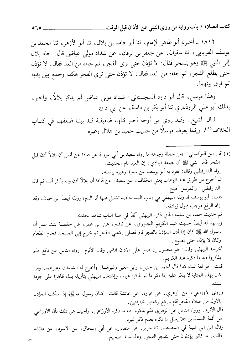 1802 - أَخْبَرَنَا أَبُو طَاهِرٍ الْإِمَامُ ثنا أَبُو حَامِدِ بْنُ بِلَالٍ ثنا أَبُو الْأَزْهَرِ ثنا مُحَمَّدُ بْنُ يُوسُفَ الْفِرْيَابِيُّ ثنا سُفْيَانُ عَنْ جَعْفَرِ بْنِ بُرْقَانَ عَنْ شَدَّادٍ مَوْلَى عِيَاضٍ قَالَ: جَاءَ بِلَالٌ إِلَى النَّبِيِّ صَلَّى اللهُ عَلَيْهِ وَسَلَّمَ وَهُوَ يَتَسَحَّرُ فَقَالَ: §" لَا تُؤَذِّنُ حَتَّى تَرَى الْفَجْرَ " ثُمَّ جَاءَهُ مِنَ الْغَدِ فَقَالَ: " لَا تُؤَذِّنُ حَتَّى يَطْلُعَ الْفَجْرُ " ثُمَّ جَاءَهُ مِنَ الْغَدِ فَقَالَ: " لَا تُؤَذِّنُ حَتَّى تَرَى الْفَجْرَ هَكَذَا " وَجَمَعَ بَيْنَ يَدَيْهِ ثُمَّ فَرَّقَ بَيْنَهُمَا وَهَذَا مُرْسَلٌ قَالَ أَبُو دَاوُدَ السِّجِسْتَانِيُّ: شَدَّادٌ مَوْلَى عِيَاضٍ لَمْ يَذْكُرْ بِلَالًا وَأَخْبَرَنَا بِذَلِكَ أَبُو عَلِيٍّ الرُّوذْبَارِيُّ، ثنا أَبُو بَكْرِ بْنُ دَاسَةَ، عَنْ أَبِي دَاوُدَ قَالَ الشَّيْخُ: وَقَدْ رُوِيَ مِنْ أَوْجُهٍ أُخَرَ كُلُّهَا ضَعِيفَةٌ قَدْ بَيَّنَّا ضَعْفَهَا فِي كِتَابِ الْخِلَافِ وَإِنَّمَا يُعْرَفُ مُرْسَلًا مِنْ حَدِيثِ حُمَيْدِ بْنِ هِلَالٍ وَغَيْرِهِ