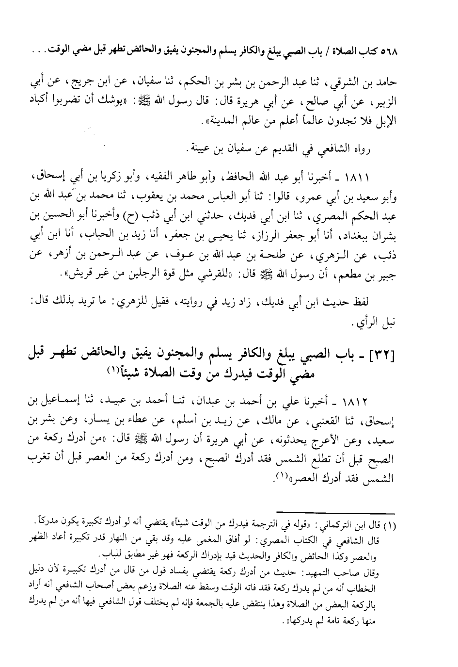 1812 - أَخْبَرَنَا عَلِيُّ بْنُ أَحْمَدَ بْنِ عَبْدَانَ ثنا أَحْمَدُ بْنُ عُبَيْدٍ ثنا إِسْمَاعِيلُ بْنُ إِسْحَاقَ ثنا الْقَعْنَبِيُّ عَنْ مَالِكٍ عَنْ زَيْدِ بْنِ أَسْلَمَ عَنْ عَطَاءِ بْنِ يَسَارٍ، وَعَنْ بِشْرِ بْنِ سَعِيدٍ، وَعَنِ الْأَعْرَجِ، يُحَدِّثُونَهُ، عَنْ أَبِي هُرَيْرَةَ، أَنَّ رَسُولَ اللهِ صَلَّى اللهُ عَلَيْهِ وَسَلَّمَ قَالَ: §" مَنْ أَدْرَكَ رَكْعَةً مِنَ الصُّبْحِ قَبْلَ أَنْ تَطْلُعَ الشَّمْسُ فَقَدْ أَدْرَكَ الصُّبْحَ، وَمَنْ أَدْرَكَ رَكْعَةً مِنَ الْعَصْرِ قَبْلَ أَنْ تَغْرُبَ الشَّمْسُ فَقَدْ أَدْرَكَ الْعَصْرَ " -[569]- رَوَاهُ الْبُخَارِيُّ فِي الصَّحِيحِ عَنِ الْقَعْنَبِيِّ وَرَوَاهُ مُسْلِمٌ، عَنْ يَحْيَى بْنِ يَحْيَى كِلَاهُمَا عَنْ مَالِكٍ