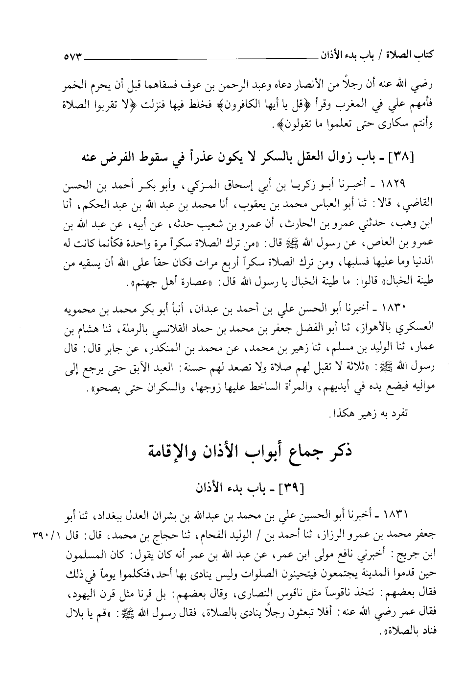 1830 - أَخْبَرَنَا أَبُو الْحَسَنِ عَلِيُّ بْنُ أَحْمَدَ بْنِ عَبْدَانَ أنبأ أَبُو بَكْرٍ مُحَمَّدُ بْنُ مَحْمَوَيْهِ الْعَسْكَرِيُّ بِالْأَهْوَازِ، ثنا أَبُو الْفَضْلِ جَعْفَرُ بْنُ مُحَمَّدِ بْنِ حَمَّادٍ الْقَلَانِسِيُّ بِالرَّمْلَةِ، ثنا هِشَامُ بْنُ عَمَّارٍ ثنا الْوَلِيدُ بْنُ مُسْلِمٍ ثنا زُهَيْرُ بْنُ مُحَمَّدٍ عَنْ مُحَمَّدِ بْنِ الْمُنْكَدِرِ عَنْ جَابِرٍ، قَالَ: قَالَ رَسُولُ اللهِ صَلَّى اللهُ عَلَيْهِ وَسَلَّمَ: " §ثَلَاثَةٌ لَا تُقْبَلُ لَهُمْ صَلَاةٌ وَلَا تَصْعَدُ لَهُمْ حَسَنَةٌ: الْعَبْدُ الْآبِقُ حَتَّى يَرْجِعَ إِلَى مَوَالِيهِ فَيَضَعَ يَدَهُ فِي أَيْدِيهِمْ، وَالْمَرْأَةُ السَّاخِطُ عَلَيْهَا زَوْجُهَا، وَالسَّكْرَانُ حَتَّى يَصْحُوَ " تَفَرَّدَ بِهِ زُهَيْرٌ هَكَذَا