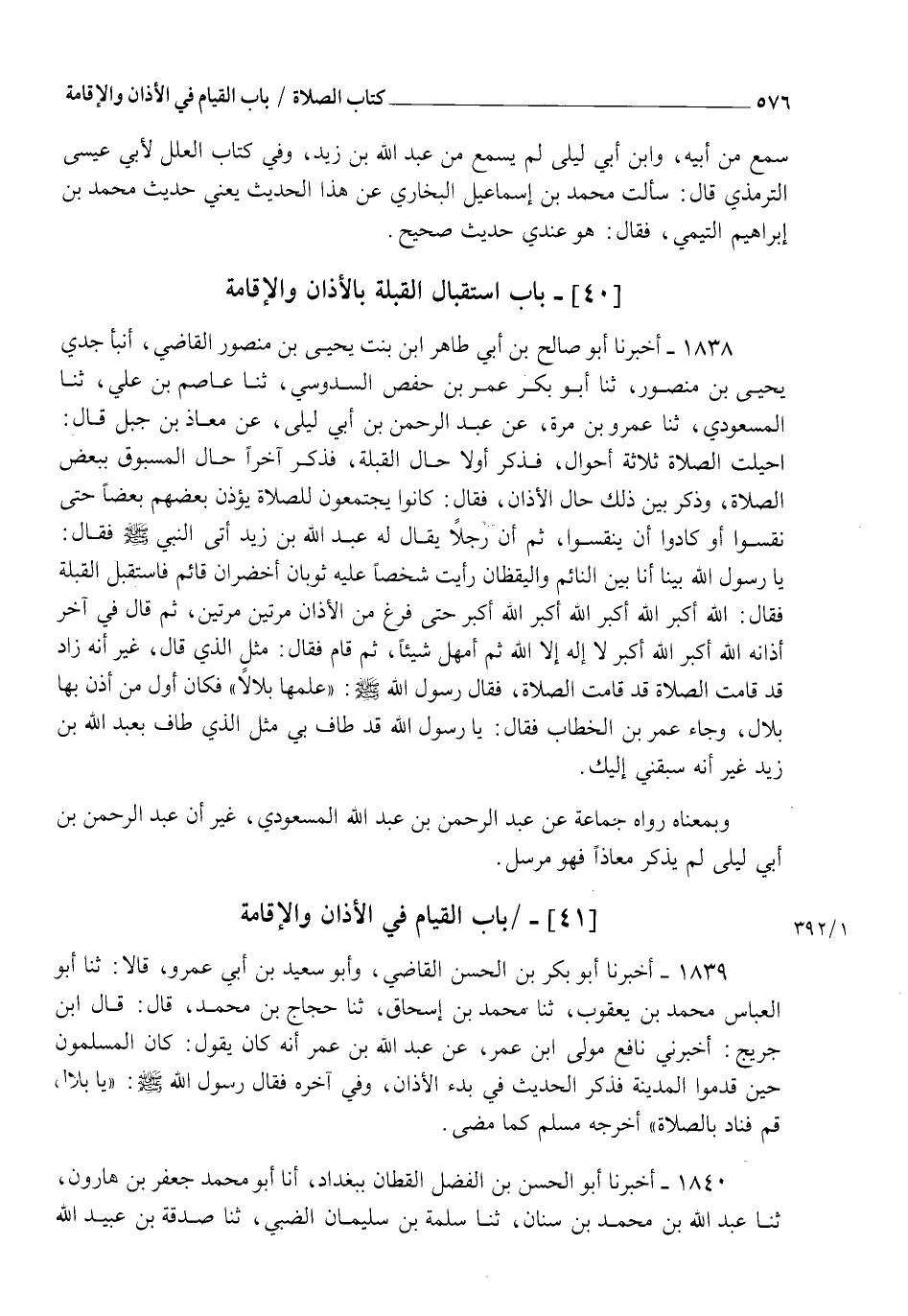 1840 - أَخْبَرَنَا أَبُو الْحُسَيْنِ بْنُ الْفَضْلِ الْقَطَّانُ بِبَغْدَادَ أنا أَبُو مُحَمَّدٍ جَعْفَرُ بْنُ هَارُونَ، ثنا عَبْدُ اللهِ بْنُ مُحَمَّدِ بْنِ سِنَانٍ ثنا سَلَمَةُ بْنُ سُلَيْمَانَ الضَّبِّيُّ ثنا صَدَقَةُ بْنُ عُبَيْدِ اللهِ -[577]- الْمَازِنِيُّ ثنا الْحَارِثُ بْنُ عُتْبَةَ عَنْ عَبْدِ الْجَبَّارِ بْنِ وَائِلٍ، عَنْ أَبِيهِ، قَالَ: §" حَقٌّ وَسُنَّةٌ مَسْنُونَةٌ أَنْ لَا يُؤَذِّنَ الرَّجُلُ إِلَّا وَهُوَ طَاهِرٌ وَلَا يُؤَذِّنُ إِلَّا وَهُوَ قَائِمٌ "