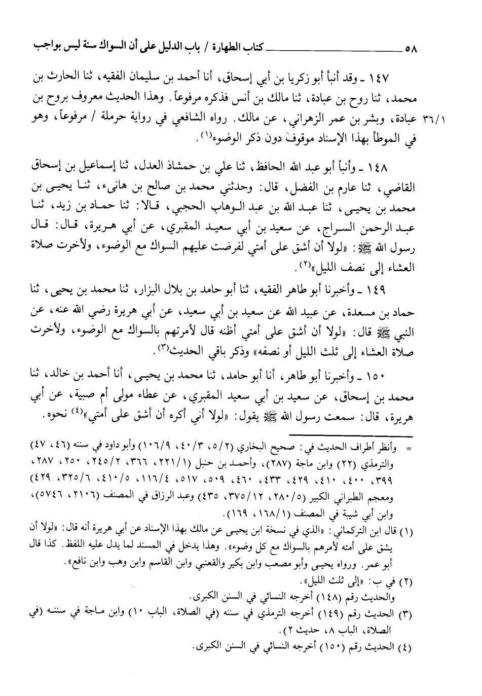 148 - وَأنبأ أَبُو عَبْدِ اللهِ الْحَافِظُ، ثنا عَلِيُّ بْنُ حَمْشَاذٍ الْعَدْلُ، ثنا إِسْمَاعِيلُ بْنُ إِسْحَاقَ الْقَاضِي، ثنا عَارِمُ بْنُ الْفَضْلِ، قَالَ: وَحَدَّثَنِي مُحَمَّدُ بْنُ صَالِحِ بْنِ هَانِئٍ، ثنا يَحْيَى بْنُ مُحَمَّدِ بْنِ يَحْيَى، ثنا عَبْدُ اللهِ بْنُ عَبْدِ الْوَهَّابِ الْحَجَبِيُّ، قَالَا: ثنا حَمَّادُ بْنُ زَيْدٍ، ثنا عَبْدُ الرَّحْمَنِ السَّرَّاجُ، عَنْ سَعِيدِ بْنِ أَبِي سَعِيدٍ الْمَقْبُرِيِّ، عَنْ أَبِي هُرَيْرَةَ، قَالَ: قال رَسُولَ اللهِ صَلَّى اللهُ عَلَيْهِ وَسَلَّمَ: §" لَوْلَا أَنْ أَشُقَّ عَلَى أُمَّتِي لَفَرَضْتُ عَلَيْهِمُ السِّوَاكَ مَعَ الْوُضُوءِ، وَلَأَخَّرْتُ صَلَاةَ الْعِشَاءِ إِلَى نِصْفِ اللَّيْلِ "