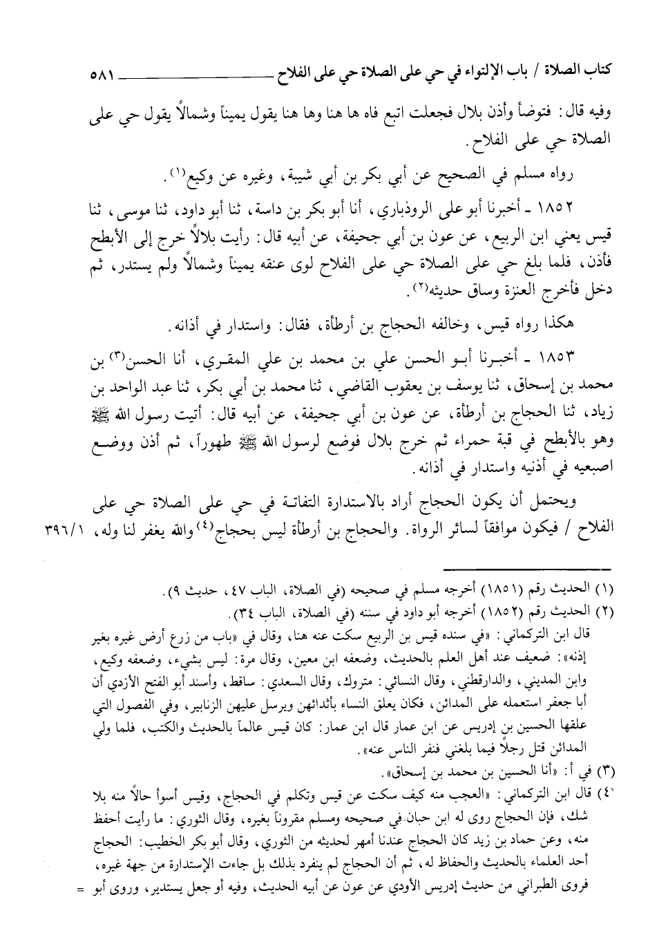 1853 - أَخْبَرَنَا أَبُو الْحَسَنِ عَلِيُّ بْنُ مُحَمَّدِ بْنِ عَلِيٍّ الْمُقْرِئُ أنا الْحَسَنُ بْنُ مُحَمَّدِ بْنِ إِسْحَاقَ ثنا يُوسُفُ بْنُ يَعْقُوبَ الْقَاضِي ثنا مُحَمَّدُ بْنُ أَبِي بَكْرٍ ثنا عَبْدُ الْوَاحِدِ بْنُ زِيَادٍ ثنا الْحَجَّاجُ بْنُ أَرْطَاةَ عَنْ عَوْنِ بْنِ أَبِي جُحَيْفَةَ عَنْ أَبِيهِ، قَالَ: §" أَتَيْتُ رَسُولَ اللهِ صَلَّى اللهُ عَلَيْهِ وَسَلَّمَ وَهُوَ بِالْأَبْطَحِ فِي قُبَّةٍ حَمْرَاءَ ثُمَّ خَرَجَ بِلَالٌ فَوَضَعَ لِرَسُولِ اللهِ صَلَّى اللهُ عَلَيْهِ وَسَلَّمَ طَهُورًا ثُمَّ أَذَّنَ وَوَضَعَ أُصْبُعَيْهِ فِي أُذُنَيْهِ وَاسْتَدَارَ فِي أَذَانِهِ " وَيُحْتَمَلُ أَنْ يَكُونَ الْحَجَّاجُ أَرَادَ بِالِاسْتِدَارَةِ الْتِفَاتَهُ فِي حِيَّ عَلَى الصَّلَاةِ حِيَّ عَلَى الْفَلَاحِ، فَيَكُونُ مُوَافِقًا لِسَائِرِ الرُّوَاةِ، وَالْحَجَّاجُ بْنُ أَرْطَاةَ لَيْسَ بِحِجَاجٍ، وَاللهُ يَغْفِرُ لَنَا وَلَهُ، -[582]- وَقَدْ رَوَاهُ إِجَازَةً عَبْدُ الرَّزَّاقِ، عَنْ سُفْيَانَ الثَّوْرِيِّ، عَنْ عَوْنِ بْنِ أَبِي جُحَيْفَةَ مُدْرَجًا فِي الْحَدِيثِ وَسُفْيَانُ إِنَّمَا رَوَى هَذِهِ اللفظةَ فِي الْجَامِعِ رِوَايَةَ الْعَدَنِيِّ عَنْهُ، عَنْ رَجُلٍ لَمْ يُسَمِّهِ، عَنْ عَوْنٍ، وَرُوِيَ عَنْ حَمَّادِ بْنِ سَلَمَةَ، عَنْ عَوْنِ بْنِ أَبِي جُحَيْفَةَ مُرْسَلًا لَمْ يَقُلْ عَنْ أَبِيهِ، وَاللهُ أَعْلَمُ