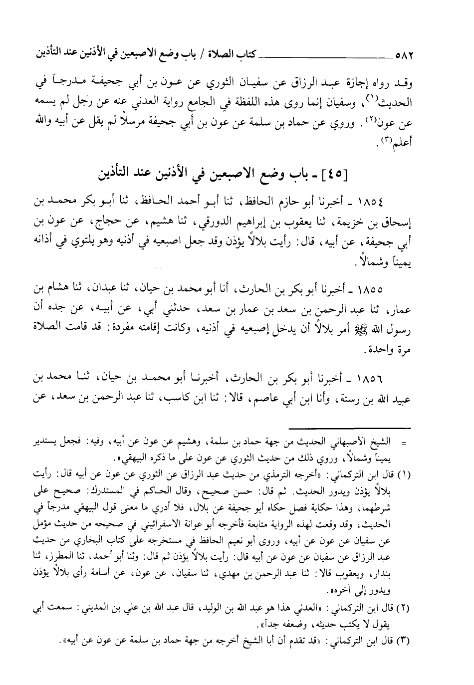 1854 - أَخْبَرَنَا أَبُو حَازِمٍ الْحَافِظُ ثنا أَبُو أَحْمَدَ الْحَافِظُ ثنا أَبُو بَكْرٍ مُحَمَّدُ بْنُ إِسْحَاقَ بْنِ خُزَيْمَةَ، ثنا يَعْقُوبُ بْنُ إِبْرَاهِيمَ الدَّوْرَقِيُّ ثنا هُشَيْمٌ عَنْ حَجَّاجٍ عَنْ عَوْنِ بْنِ أَبِي جُحَيْفَةَ عَنْ أَبِيهِ، قَالَ: رَأَيْتُ بِلَالًا §يُؤَذِّنُ وَقَدْ جَعَلَ أُصْبُعَيْهِ فِي أُذُنَيْهِ وَهُوَ يَلْتَوِي فِي أَذَانِهِ يَمِينًا وَشِمَالًا "
