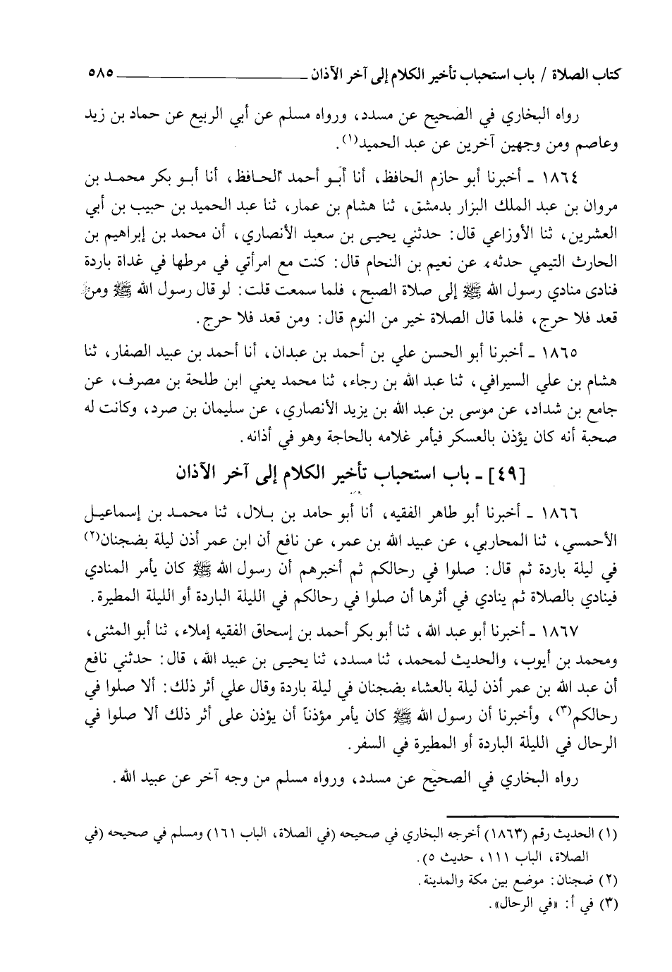 1867 - أَخْبَرَنَا أَبُو عَبْدِ اللهِ ثنا أَبُو بَكْرٍ أَحْمَدُ بْنُ إِسْحَاقَ الْفَقِيهُ إِمْلَاءً، ثنا أَبُو الْمُثَنَّى، وَمُحَمَّدُ بْنُ أَيُّوبَ، وَالْحَدِيثُ لِمُحَمَّدٍ، ثنا مُسَدَّدٌ ثنا يَحْيَى بْنُ عُبَيْدِ اللهِ، قَالَ: حَدَّثَنِي نَافِعٌ، أَنَّ عَبْدَ اللهِ بْنَ عُمَرَ، أَذَّنَ لَيْلَةً بِالْعِشَاءِ بِضَجْنَانَ فِي لَيْلَةٍ بَارِدَةٍ وَقَالَ عَلَى إِثْرِ ذَلِكَ: أَلَا صَلُّوا فِي رِحَالِكُمْ، وَأَخْبَرَنَا أَنَّ رَسُولَ اللهِ صَلَّى اللهُ عَلَيْهِ وَسَلَّمَ كَانَ §يَأْمُرُ مُؤَذِّنًا أَنْ يُؤَذِّنَ عَلَى إِثْرِ ذَلِكَ: أَلَا صَلُّوا فِي الرِّحَالِ فِي اللَّيْلَةِ الْبَارِدَةِ أَوِ الْمَطِيرَةِ فِي السَّفَرِ " رَوَاهُ الْبُخَارِيُّ فِي الصَّحِيحِ، عَنْ مُسَدَّدٍ وَرَوَاهُ مُسْلِمٌ مِنْ وَجْهٍ آخَرَ، عَنْ عُبَيْدِ اللهِ