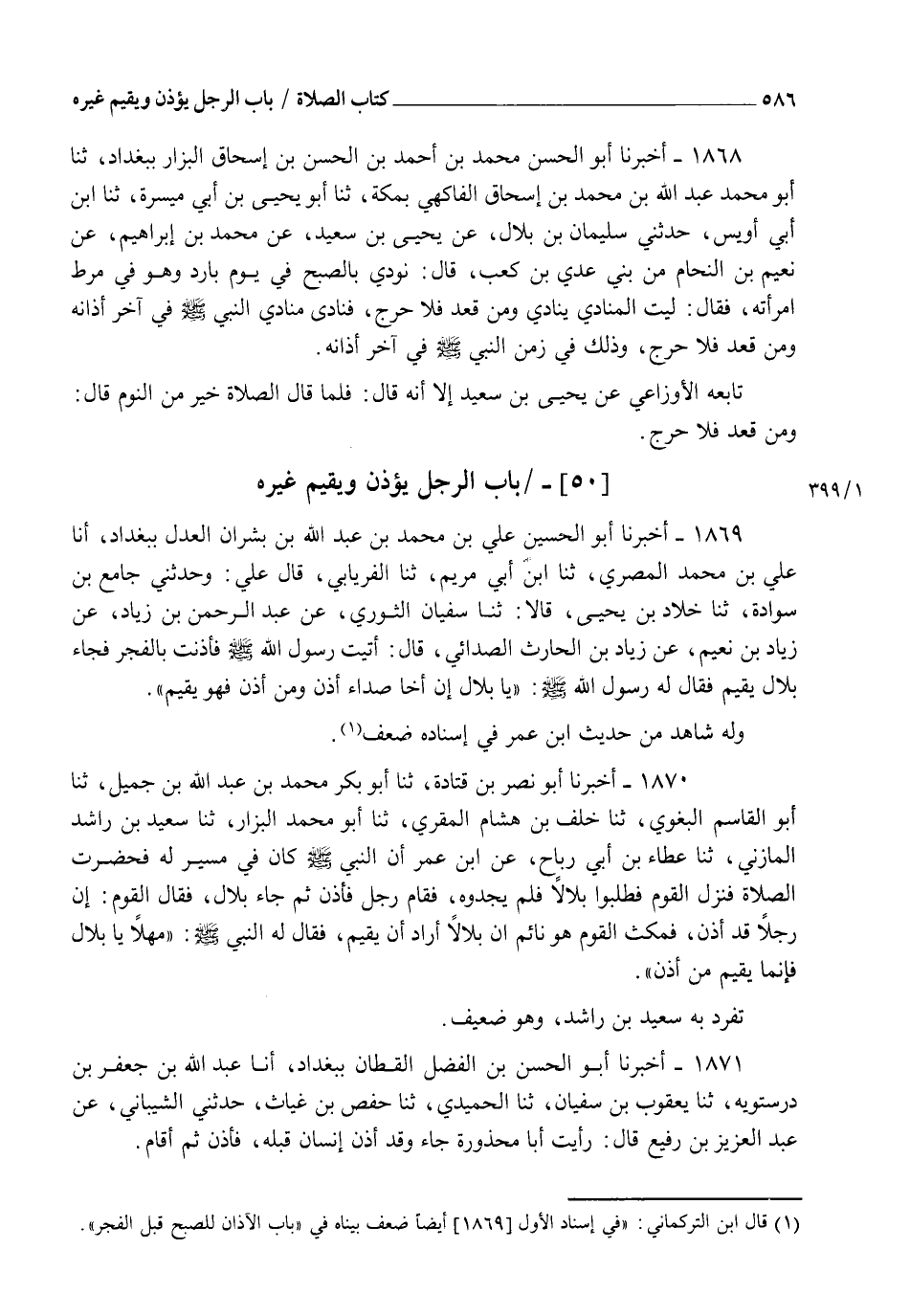 1870 - أَخْبَرَنَا أَبُو نَصْرِ بْنُ قَتَادَةَ ثنا أَبُو بَكْرٍ مُحَمَّدُ بْنُ عَبْدِ اللهِ بْنِ جَمِيلٍ ثنا أَبُو الْقَاسِمِ الْبَغَوِيُّ ثنا خَلَفُ بْنُ هِشَامٍ الْمُقْرِئُ ثنا أَبُو مُحَمَّدٍ الْبَزَّارُ ثنا سَعِيدُ بْنُ رَاشِدٍ الْمَازِنِيُّ ثنا عَطَاءُ بْنُ أَبِي رَبَاحٍ، عَنِ ابْنِ عُمَرَ، أَنَّ النَّبِيَّ صَلَّى اللهُ عَلَيْهِ وَسَلَّمَ كَانَ فِي مَسِيرٍ لَهُ فَحَضَرَتِ الصَّلَاةُ فَنَزَلَ الْقَوْمُ فَطَلَبُوا بِلَالًا فَلَمْ يَجِدُوهُ فَقَامَ رَجُلٌ فَأَذَّنَ ثُمَّ جَاءَ بِلَالٌ فَقَالَ الْقَوْمُ: إِنَّ رَجُلًا قَدْ أَذَّنَ فَمَكَثَ الْقَوْمُ هُوَ نَائِمٌ إِنَّ بِلَالًا أَرَادَ أَنْ يُقِيمَ فَقَالَ لَهُ النَّبِيُّ صَلَّى اللهُ عَلَيْهِ وَسَلَّمَ: " مَهْلًا يَا بِلَالُ §فَإِنَّمَا يُقِيمُ مَنْ أَذَّنَ " تَفَرَّدَ بِهِ سَعِيدُ بْنُ رَاشِدٍ وَهُوَ ضَعِيفٌ