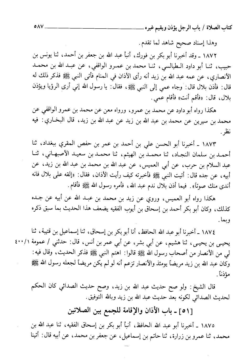 1872 - وَقَدْ أَخْبَرَنَا أَبُو بَكْرِ بْنُ فُورَكٍ، أنبأ عَبْدُ اللهِ بْنُ جَعْفَرِ بْنِ أَحْمَدَ ثنا يُونُسُ بْنُ حَبِيبٍ ثنا أَبُو دَاوُدَ الطَّيَالِسِيُّ ثنا مُحَمَّدُ بْنُ عَمْرٍو الْوَاقِفِيُّ عَنْ عَبْدِ اللهِ بْنِ مُحَمَّدٍ الْأَنْصَارِيِّ عَنْ عَمِّهِ عَبْدِ اللهِ بْنِ زَيْدٍ، أَنَّهُ §رَأَى الْأَذَانَ فِي الْمَنَامِ فَأَتَى النَّبِيَّ صَلَّى اللهُ عَلَيْهِ وَسَلَّمَ فَذَكَرَ ذَلِكَ لَهُ قَالَ: فَأَذَّنَ بِلَالٌ قَالَ: وَجَاءَ عَمِّي إِلَى النَّبِيِّ صَلَّى اللهُ عَلَيْهِ وَسَلَّمَ فَقَالَ: يَا رَسُولَ اللهِ إِنِّي أَرَى الرُّؤْيَا وَيُؤَذِّنُ بِلَالٌ؟ قَالَ: " فَأَقِمْ أَنْتَ " فَأَقَامَ عَمِّي " هَكَذَا رَوَاهُ أَبُو دَاوُدَ، عَنْ مُحَمَّدِ بْنِ عَمْرٍو وَرَوَاهُ مَعْنٌ، عَنْ مُحَمَّدِ بْنِ عَمْرٍو الْوَاقِفِيِّ، عَنْ مُحَمَّدِ بْنِ سِيرِينَ عَنْ مُحَمَّدِ بْنِ عَبْدِ اللهِ بْنِ زَيْدٍ، عَنْ عَبْدِ اللهِ بْنِ زَيْدٍ قَالَ الْبُخَارِيُّ: فِيهِ نَظَرٌ