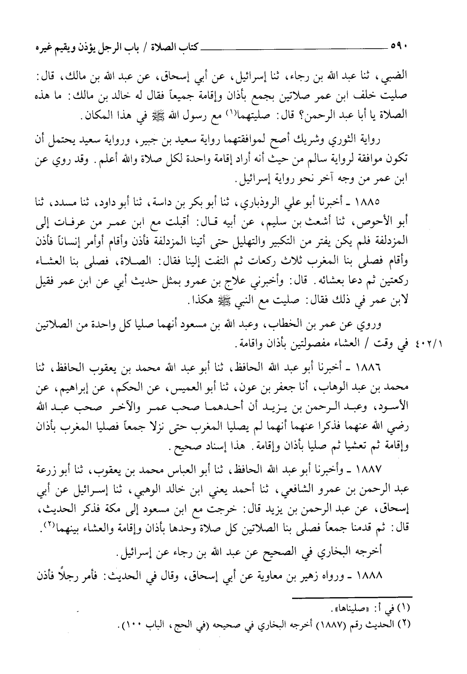 1888 - وَرَوَاهُ زُهَيْرُ بْنُ مُعَاوِيَةَ، عَنْ أَبِي إِسْحَاقَ، وقَالَ فِي الْحَدِيثِ: فَأَمَرَ رَجُلًا فَأَذَّنَ -[591]- وَأَقَامَ ثُمَّ صَلَّى الْمَغْرِبَ فَصَلَّى بَعْدَهَا رَكْعَتَيْنِ ثُمَّ دَعَا بِعَشَائِهِ ثُمَّ أَمَرَ، أُرَى شَكَّ زُهَيْرٌ فَأَذَّنَ وَأَقَامَ ثُمَّ صَلَّى الْعِشَاءَ الْآخِرَةَ رَكْعَتَيْنِ " أَخْبَرَنَاهُ مُحَمَّدُ بْنُ عَبْدِ اللهِ أَخْبَرَنِي أَبُو أَحْمَدَ الْحَافِظُ، ثنا أَبُو عَرُوبَةَ الْحَرَّانِيُّ، ثنا عَبْدُ الرَّحْمَنِ بْنُ عَمْرٍو الْبَجَلِيُّ، ثنا زُهَيْرٌ، ثنا أَبُو إِسْحَاقَ قَالَ: سَمِعْتُ عَبْدَ الرَّحْمَنِ بْنَ يَزِيدَ يَقُولُ: حَجَّ عَبْدُ اللهِ فَذَكَرَ الْحَدِيثَ وَذَكَرَ فِيهِ مَا قَدَّمْنَا ذِكِرَهُ رَوَاهُ الْبُخَارِيُّ فِي الصَّحِيحِ، عَنْ عُمَرَ بْنِ خَالِدٍ، عَنْ زُهَيْرِ بْنِ مُعَاوِيَةَ