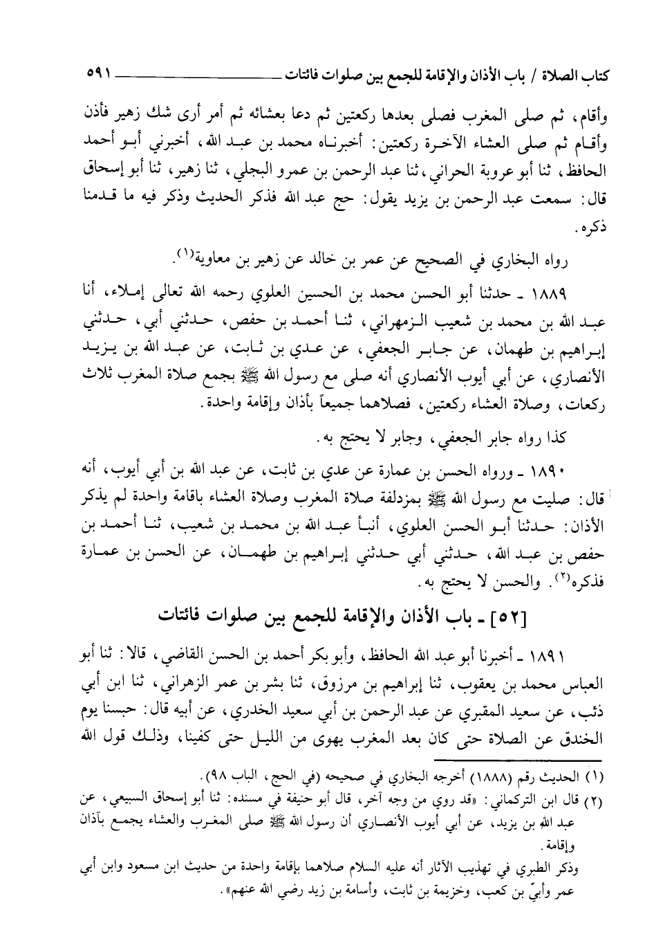 1889 - حَدَّثَنَا أَبُو الْحَسَنِ مُحَمَّدُ بْنُ الْحُسَيْنِ الْعَلَوِيُّ رَحِمَهُ اللهُ تَعَالَى إِمْلَاءً أنا عَبْدُ اللهِ بْنُ مُحَمَّدِ بْنِ شُعَيْبٍ الزَّمْهَرَانِيُّ ثنا أَحْمَدُ بْنُ حَفْصٍ، حَدَّثَنِي أَبِي، حَدَّثَنِي إِبْرَاهِيمُ بْنُ طَهْمَانَ عَنْ جَابِرٍ الْجُعْفِيِّ عَنْ عَدِيِّ بْنِ ثَابِتٍ عَنْ عَبْدِ اللهِ بْنِ يَزِيدَ الْأَنْصَارِيِّ عَنْ أَبِي أَيُّوبَ الْأَنْصَارِيِّ، أَنَّهُ §" صَلَّى مَعَ رَسُولِ اللهِ صَلَّى اللهُ عَلَيْهِ وَسَلَّمَ بِجَمْعِ صَلَاةِ الْمَغْرِبِ ثَلَاثَ رَكَعَاتٍ وَصَلَاةِ الْعِشَاءِ رَكْعَتَيْنِ فَصَلَّاهُمَا جَمِيعًا بِأَذَانٍ وَإِقَامَةٍ وَاحِدَةٍ " كَذَا رَوَاهُ جَابِرٌ الْجُعْفِيُّ وَجَابِرٌ لَا يُحْتَجُّ بِهِ