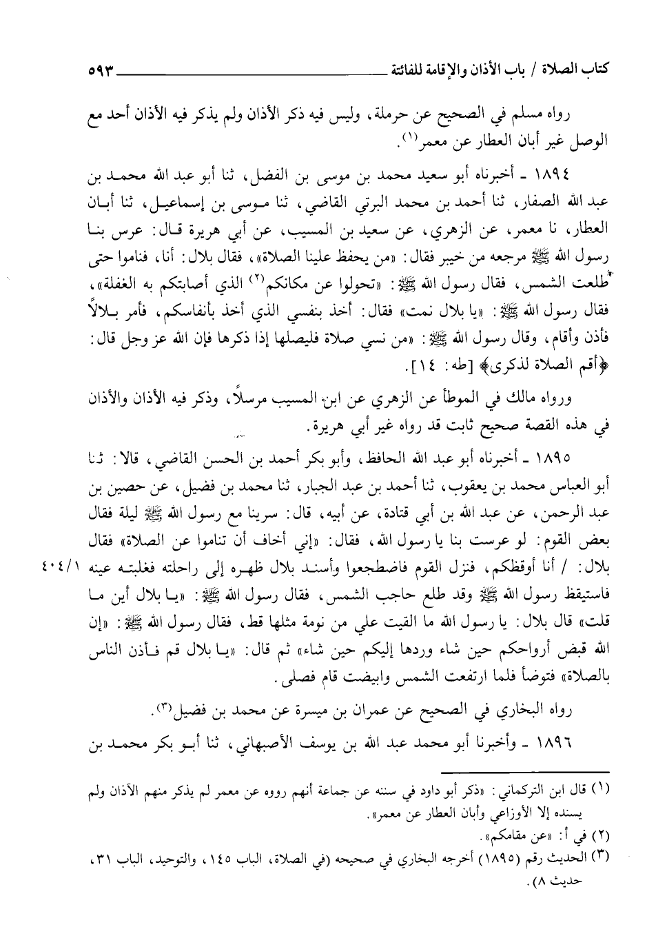 1894 - أَخْبَرَنَاهُ أَبُو سَعِيدِ مُحَمَّدُ بْنُ مُوسَى بْنِ الْفَضْلِ، ثنا أَبُو عَبْدِ اللهِ مُحَمَّدُ بْنُ عَبْدِ اللهِ الصَّفَّارُ، ثنا أَحْمَدُ بْنُ مُحَمَّدٍ الْبَرْتِيُّ الْقَاضِي ثنا مُوسَى بْنُ إِسْمَاعِيلَ ثنا أَبَانُ الْعَطَّارُ، نا مَعْمَرٌ، عَنِ الزُّهْرِيِّ عَنْ سَعِيدِ بْنِ الْمُسَيِّبِ عَنْ أَبِي هُرَيْرَةَ، قَالَ: " عَرَّسَ بِنَا رَسُولُ اللهِ صَلَّى اللهُ عَلَيْهِ وَسَلَّمَ مَرْجِعَهُ مِنْ خَيْبَرَ فَقَالَ: " مَنْ يَحْفَظُ عَلَيْنَا الصَّلَاةَ؟ " فَقَالَ بِلَالٌ: أَنَا، فَنَامُوا حَتَّى طَلَعَتِ الشَّمْسُ فَقَالَ رَسُولُ اللهِ صَلَّى اللهُ عَلَيْهِ وَسَلَّمَ: " تَحَوَّلُوا عَنْ مَكَانِكُمُ الَّذِي أَصَابَتْكُمْ بِهِ الْغَفْلَةُ " فَقَالَ رَسُولُ اللهِ صَلَّى اللهُ عَلَيْهِ وَسَلَّمَ: " يَا بِلَالُ نِمْتَ؟ " فَقَالَ: أَخَذَ بِنَفْسِي الَّذِي أَخَذَ بِأَنْفَاسِكُمْ فَأَمَرَ بِلَالًا فَأَذَّنَ وَأَقَامَ وَقَالَ رَسُولُ اللهِ صَلَّى اللهُ عَلَيْهِ وَسَلَّمَ: §" مَنْ نَسِيَ صَلَاةً فَلْيُصَلِّهَا إِذَا ذَكَرَهَا فَإِنَّ اللهَ عَزَّ وَجَلَّ قَالَ: {أَقِمِ الصَّلَاةَ لِذِكْرِي} [طه: 14] " وَرَوَاهُ مَالِكٌ فِي الْمُوَطَّأِ عَنِ الزُّهْرِيِّ عَنِ ابْنِ الْمُسَيِّبِ مُرْسَلًا وَذَكَرَ فِيهِ الْأَذَانَ، وَالْأَذَانُ فِي هَذِهِ الْقِصَّةِ صَحِيحٌ ثَابِتٌ قَدْ رَوَاهُ غَيْرُ أَبِي هُرَيْرَةَ