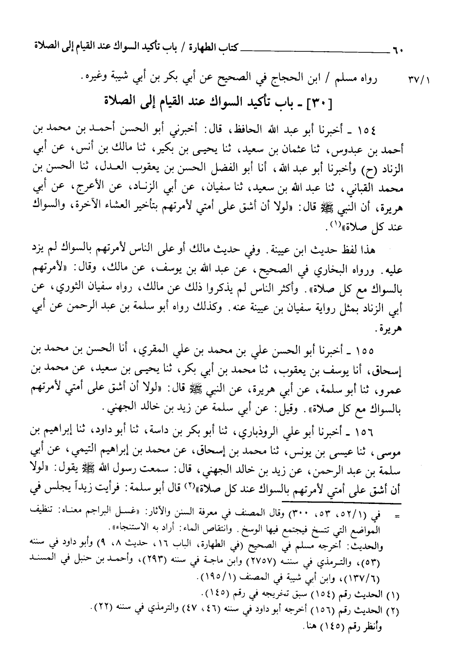 154 - أَخْبَرَنَا أَبُو عَبْدِ اللهِ الْحَافِظُ، قَالَ: أَخْبَرَنِي أَبُو الْحَسَنِ أَحْمَدُ بْنُ مُحَمَّدِ بْنِ أَحْمَدَ بْنِ عَبْدُوسٍ، ثنا عُثْمَانُ بْنُ سَعِيدٍ، ثنا يَحْيَى بْنُ بُكَيْرٍ، ثنا مَالِكُ بْنُ أَنَسٍ، عَنْ أَبِي الزِّنَادِ، ح. وَأَخْبَرَنَا أَبُو عَبْدِ اللهِ، أنا أَبُو الْفَضْلِ الْحَسَنُ بْنُ يَعْقُوبَ الْعَدْلُ، ثنا الْحَسَنُ بْنُ مُحَمَّدٍ الْقَبَّانِيُّ، ثنا عَبْدُ اللهِ بْنُ سَعِيدٍ، ثنا سُفْيَانُ، عَنْ أَبِي الزِّنَادِ، عَنِ الْأَعْرَجِ، عَنْ أَبِي هُرَيْرَةَ، أَنَّ النَّبِيَّ صَلَّى اللهُ عَلَيْهِ وَسَلَّمَ قَالَ: " §لَوْلَا أَنْ أَشُقَّ عَلَى أُمَّتِي لَأَمَرْتُهُمْ بِتَأْخِيرِ الْعِشَاءِ الْآخِرَةِ، وَالسِّوَاكِ عِنْدَ كُلِّ صَلَاةٍ ". هَذَا لَفْظُ حَدِيثِ ابْنِ عُيَيْنَةَ. وَفِي حَدِيثِ مَالِكٍ: " أَوْ عَلَى النَّاسِ لَأَمَرْتُهُمْ بِالسِّوَاكِ ". لَمْ يَزِدْ عَلَيْهِ. وَرَوَاهُ الْبُخَارِيُّ فِي الصَّحِيحِ، عَنْ عَبْدِ اللهِ بْنِ يُوسُفَ، عَنْ مَالِكٍ وَقَالَ: لَأَمَرْتُهُمْ بِالسِّوَاكِ مَعَ كُلِّ صَلَاةٍ. وَأَكْثَرُ النَّاسِ لَمْ يَذْكُرُوا ذَلِكَ، عَنْ مَالِكٍ. رَوَاهُ سُفْيَانُ الثَّوْرِيُّ، عَنْ أَبِي الزِّنَادِ، بِمِثْلِ رِوَايَةِ سُفْيَانَ بْنِ عُيَيْنَةَ عَنْهُ. وَكَذَلِكَ رَوَاهُ أَبُو سَلَمَةَ بْنُ عَبْدِ الرَّحْمَنِ، عَنْ أَبِي هُرَيْرَةَ