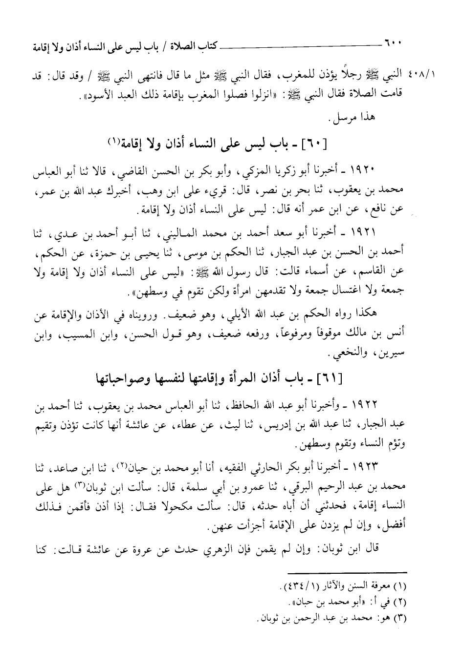 1920 - أَخْبَرَنَا أَبُو زَكَرِيَّا الْمُزَكِّي، وَأَبُو بَكْرِ بْنُ الْحَسَنِ الْقَاضِي قَالَا: ثنا أَبُو الْعَبَّاسِ مُحَمَّدُ بْنُ يَعْقُوبَ، ثنا بَحْرُ بْنُ نَصْرٍ، قَالَ: قُرِئَ عَلَى ابْنِ وَهْبٍ: أَخْبَرَكَ عَبْدُ اللهِ بْنُ عُمَرَ عَنْ نَافِعٍ، عَنِ ابْنِ عُمَرَ، أَنَّهُ قَالَ: §" لَيْسَ عَلَى النِّسَاءِ أَذَانٌ وَلَا إِقَامَةٌ "