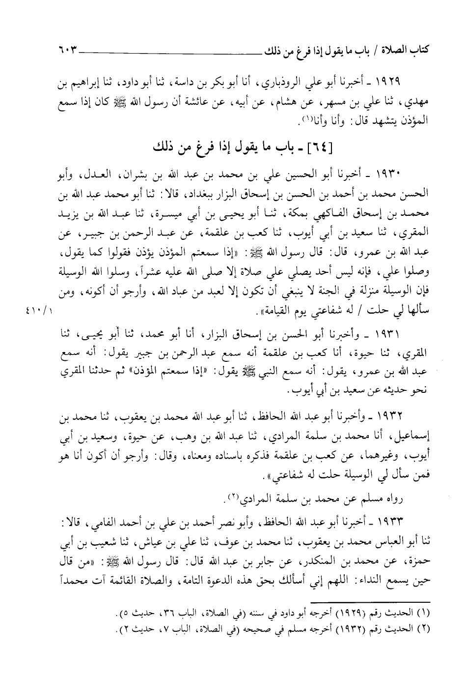 1930 - أَخْبَرَنَا أَبُو الْحُسَيْنِ عَلِيُّ بْنُ مُحَمَّدِ بْنِ عَبْدِ اللهِ بْنِ بِشْرَانَ الْعَدْلُ وَأَبُو الْحَسَنِ مُحَمَّدُ بْنُ أَحْمَدَ بْنِ الْحُسَيْنِ بْنِ إِسْحَاقَ الْبَزَّارُ بِبَغْدَادَ قَالَا: ثنا أَبُو مُحَمَّدٍ عَبْدُ اللهِ بْنُ مُحَمَّدِ بْنِ إِسْحَاقَ الْفَاكِهِيُّ بِمَكَّةَ، ثنا أَبُو يَحْيَى بْنُ أَبِي مَسَرَّةَ ثنا عَبْدُ اللهِ بْنُ يَزِيدَ الْمُقْرِئُ ثنا سَعِيدُ بْنُ أَبِي أَيُّوبَ ثنا كَعْبُ بْنُ عَلْقَمَةَ عَنْ عَبْدِ الرَّحْمَنِ بْنِ جُبَيْرٍ عَنْ عَبْدِ اللهِ بْنِ عَمْرٍو، قَالَ: قَالَ رَسُولُ اللهِ صَلَّى اللهُ عَلَيْهِ وَسَلَّمَ: §" إِذَا سَمِعْتُمُ الْمُؤَذِّنَ يُؤَذِّنُ فَقُولُوا كَمَا يَقُولُ وَصَلُّوا عَلَيَّ فَإِنَّهُ لَيْسَ أَحَدٌ يُصَلِّي عَلَيَّ صَلَاةً إِلَّا صَلَّى اللهُ عَلَيْهِ وَسَلَّمَ عَشْرًا وَسَلُوا اللهَ لِيَ الْوَسِيلَةَ فَإِنَّ الْوَسِيلَةَ مَنْزِلَةٌ فِي الْجَنَّةِ لَا يَنْبَغِي أَنْ تَكُونَ إِلَّا لِعَبْدٍ مِنْ عِبَادِ اللهِ وَأَرْجُو أَنْ أَكُونَهُ، وَمَنْ سَأَلَهَا لِي حَلَّتْ لَهُ شَفَاعَتِي يَوْمَ الْقِيَامَةِ "