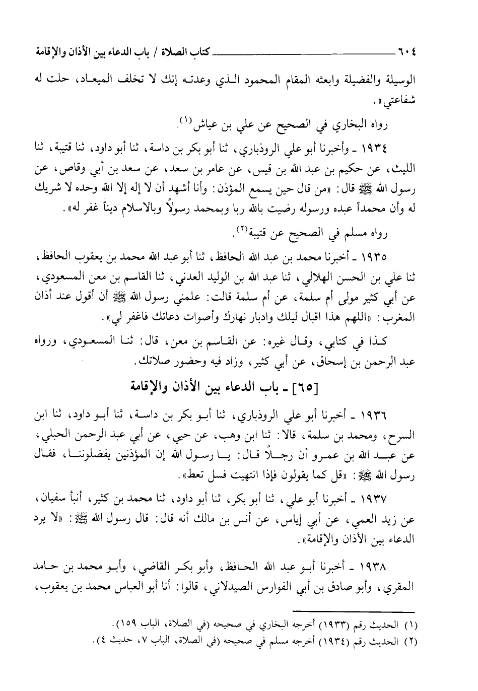 1934 - وَأَخْبَرَنَا أَبُو عَلِيٍّ الرُّوذْبَارِيُّ ثنا أَبُو بَكْرِ بْنُ دَاسَةَ ثنا أَبُو دَاوُدَ ثنا قُتَيْبَةُ ثنا اللَّيْثُ عَنْ حَكِيمِ بْنِ عَبْدِ اللهِ بْنِ قَيْسٍ عَنْ عَامِرِ بْنِ سَعْدٍ عَنْ سَعْدِ بْنِ أَبِي وَقَّاصٍ عَنْ رَسُولِ اللهِ صَلَّى اللهُ عَلَيْهِ وَسَلَّمَ قَالَ: " §مَنْ قَالَ حِينَ يَسْمَعُ الْمُؤَذِّنَ: وَأَنَا أَشْهَدُ أَنْ لَا إِلَهَ إِلَّا اللهُ وَحْدَهُ لَا شَرِيكَ لَهُ وَأَنَّ مُحَمَّدًا عَبْدُهُ وَرَسُولُهُ، رَضِيتُ بِاللهِ رِبًّا وَبِمُحَمَّدٍ رَسُولًا وَبِالْإِسْلَامِ دِينًا غُفِرَ لَهُ " رَوَاهُ مُسْلِمٌ فِي الصَّحِيحِ، عَنْ قُتَيْبَةَ
