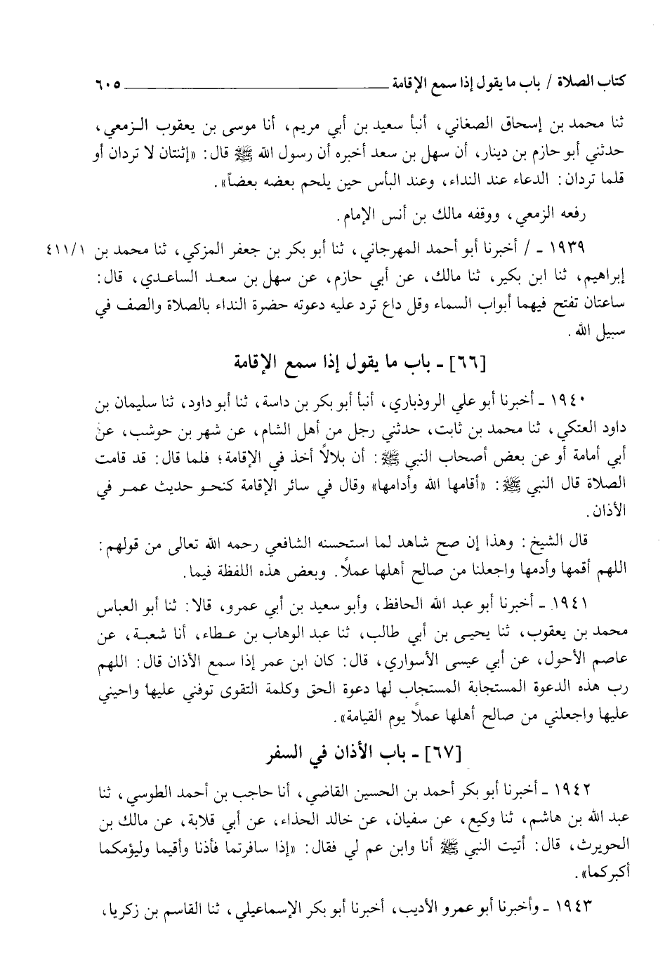 1943 - وَأَخْبَرَنَا أَبُو عَمْرٍو الْأَدِيبُ، أَخْبَرَنَا أَبُو بَكْرٍ الْإِسْمَاعِيلِيُّ ثنا الْقَاسِمُ بْنُ زَكَرِيَّا، -[606]- وَالْمَنِيعِيُّ، قَالَا: ثنا ابْنُ زَنْجُوَيْهِ ثنا الْفِرْيَابِيُّ عَنْ سُفْيَانَ، فَذَكَرَهُ بِإِسْنَادِهِ وَمَعْنَاهُ إِلَّا أَنَّهُ لَمْ يَذْكُرْ قَوْلَهُ ابْنُ عَمٍّ لِي رَوَاهُ الْبُخَارِيُّ فِي الصَّحِيحِ، عَنْ مُحَمَّدِ بْنِ يُوسُفَ الْفِرْيَابِيِّ وَفِيمَا مَضَى مِنْ حَدِيثِ أَبِي جُحَيْفَةَ فِي أَذَانِ بِلَالٍ بِالْأَبْطَحِ وَحَدِيثِ أَبِي قَتَادَةَ وَغَيْرِهِ فِي أَذَانِ بِلَالٍ مُنْصَرَفَهُمْ مِنْ خَيْبَرَ وَفِيمَا نَذْكُرُهُ فِي مَسْأَلَةِ الْإِبْرَادِ بِالظُّهْرِ مِنْ حَدِيثِ أَبِي ذَرٍّ دَلِيلٌ عَلَى أَنَّ الْأَذَانَ وَالْإِقَامَةَ مِنْ سُنَّةِ الصَّلَاةِ فِي السَّفَرِ