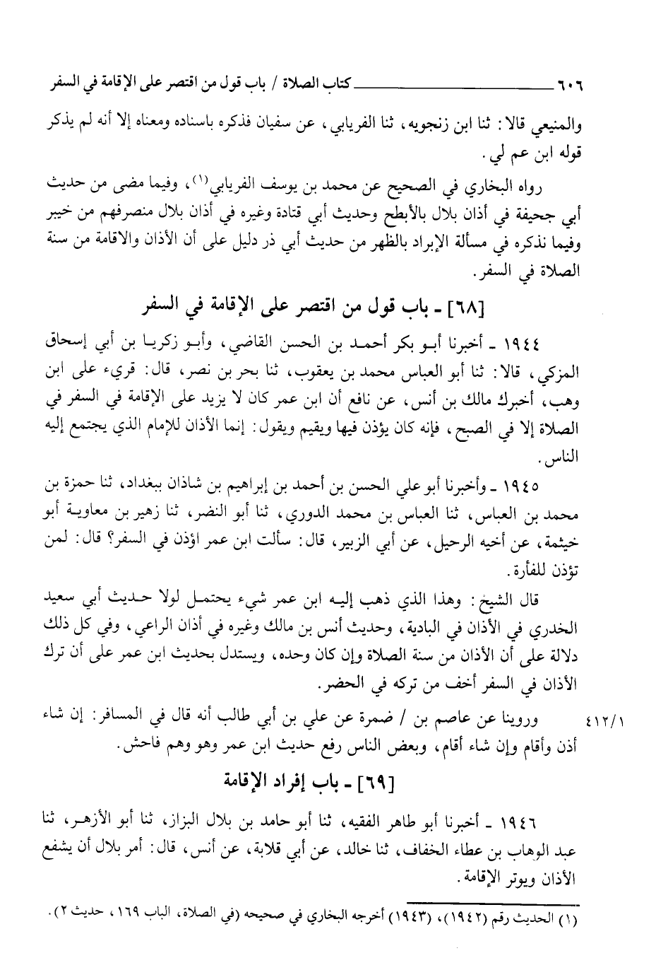 1945 - وَأَخْبَرَنَا أَبُو عَلِيٍّ الْحَسَنُ بْنُ أَحْمَدَ بْنِ إِبْرَاهِيمَ بْنِ شَاذَانَ بِبَغْدَادَ، ثنا حَمْزَةُ بْنُ مُحَمَّدِ بْنِ الْعَبَّاسِ ثنا الْعَبَّاسُ بْنُ مُحَمَّدٍ الدُّورِيُّ ثنا أَبُو النَّضْرِ ثنا زُهَيْرُ بْنُ مُعَاوِيَةَ أَبُو خَيْثَمَةَ عَنْ أَخِيهِ الرُّحَيْلِ عَنْ أَبِي الزُّبَيْرِ، قَالَ: سَأَلْتُ ابْنَ عُمَرَ §يُؤَذَّنُ فِي السَّفَرِ؟ قَالَ: " لِمَنْ تُؤَذِّنُ لِلْفَأْرَةِ؟ " قَالَ الشَّيْخُ: وَهَذَا الَّذِي ذَهَبَ إِلَيْهِ ابْنُ عُمَرَ يُحْتَمَلُ، لَوْلَا حَدِيثُ أَبِي سَعِيدٍ الْخُدْرِيِّ فِي الْأَذَانِ فِي الْبَادِيَةِ وَحَدِيثِ أَنَسِ بْنِ مَالِكٍ وَغَيْرِهِ فِي أَذَانِ الرَّاعِي وَفِي كُلِّ ذَلِكَ دَلَالَةٌ عَلَى أَنَّ الْأَذَانَ مِنْ سُنَّةِ الصَّلَاةِ وَإِنْ كَانَ وَحْدَهُ، وَيُسْتَدَلُّ بِحَدِيثِ ابْنِ عُمَرَ عَلَى أَنَّ تَرْكَ الْأَذَانِ فِي السَّفَرِ أَخَفُّ مِنْ تَرْكِهِ فِي الْحَضَرِ، وَرُوِّينَا عَنْ عَاصِمِ بْنِ ضَمْرَةَ، عَنْ عَلِيِّ بْنِ أَبِي طَالِبٍ أَنَّهُ قَالَ فِي الْمُسَافِرِ: إِنْ شَاءَ أَذَّنَ وَأَقَامَ، وَإِنْ شَاءَ أَقَامَ، وَبَعْضُ النَّاسِ رَفَعَ حَدِيثَ ابْنِ عُمَرَ، وَهُوَ وَهْمٌ فَاحِشٌ