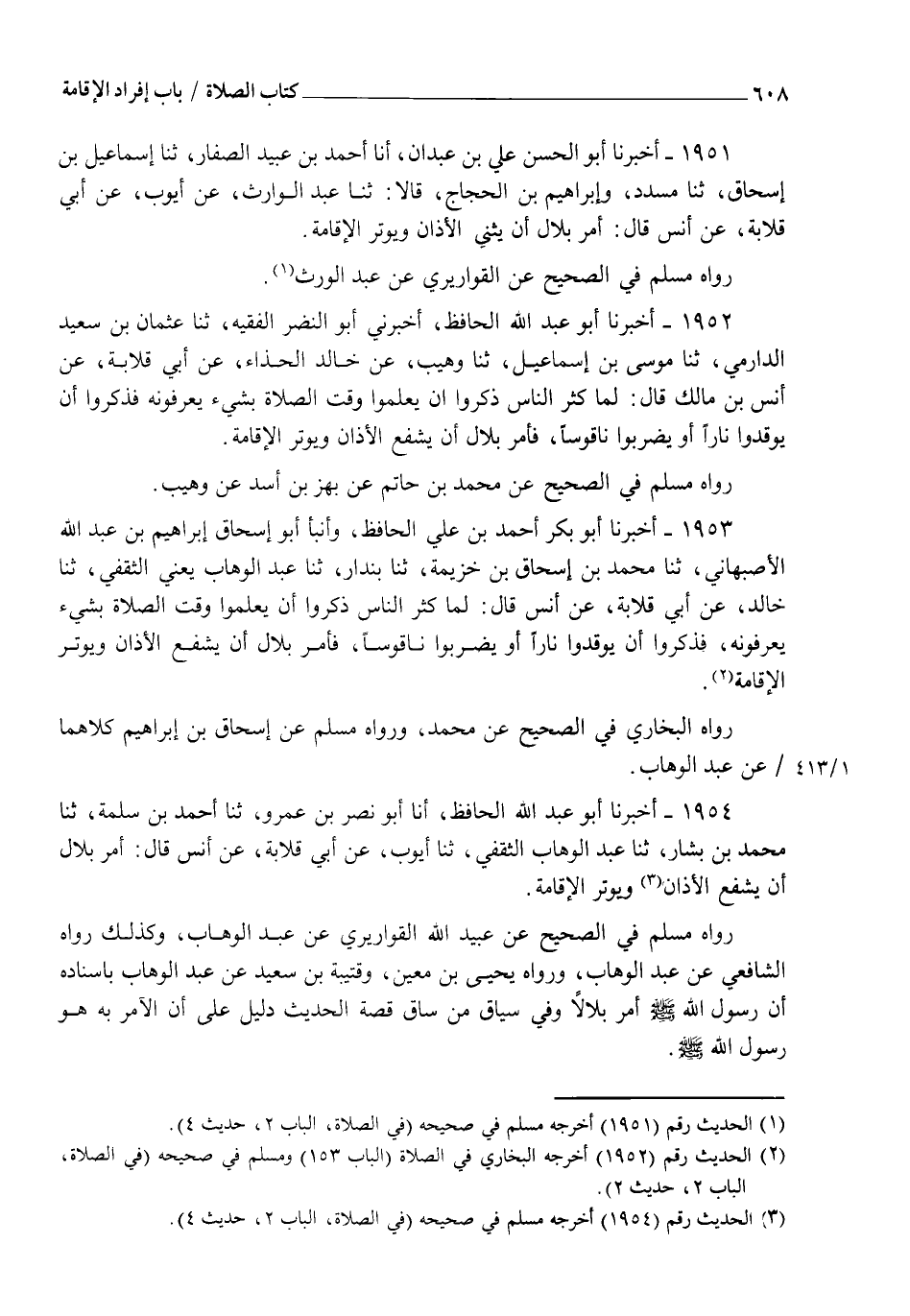 1951 - أَخْبَرَنَا أَبُو الْحَسَنِ عَلِيُّ بْنُ عَبْدَانَ أنا أَحْمَدُ بْنُ عُبَيْدٍ الصَّفَّارُ ثنا إِسْمَاعِيلُ بْنُ إِسْحَاقَ ثنا مُسَدَّدٌ، وَإِبْرَاهِيمُ بْنُ الْحَجَّاجِ، قَالَا: ثنا عَبْدُ الْوَارِثِ عَنْ أَيُّوبَ عَنْ أَبِي قِلَابَةَ عَنْ أَنَسٍ، قَالَ: " §أُمِرَ بِلَالٌ أَنْ يُثَنِّيَ الْأَذَانَ وَيُوتِرَ الْإِقَامَةَ " رَوَاهُ مُسْلِمٌ فِي الصَّحِيحِ عَنِ الْقَوَارِيرِيِّ، عَنْ عَبْدِ الْوَارِثِ