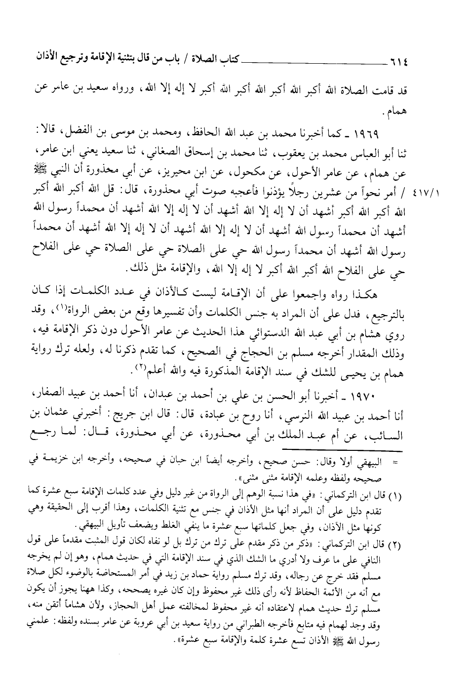 1969 - كَمَا أَخْبَرَنَا مُحَمَّدُ بْنُ عَبْدِ اللهِ الْحَافِظُ، وَمُحَمَّدُ بْنُ مُوسَى بْنِ الْفَضْلِ، قَالَا: ثنا أَبُو الْعَبَّاسِ مُحَمَّدُ بْنُ يَعْقُوبَ، ثنا مُحَمَّدُ بْنُ إِسْحَاقَ الصَّغَانِيُّ ثنا سَعِيدٌ يَعْنِي ابْنَ عَامِرٍ عَنْ هَمَّامٍ عَنْ عَامِرٍ الْأَحْوَلِ عَنْ مَكْحُولٍ، عَنِ ابْنِ مُحَيْرِيزٍ عَنْ أَبِي مَحْذُورَةَ، أَنَّ النَّبِيَّ صَلَّى اللهُ عَلَيْهِ وَسَلَّمَ أَمَرَ نَحْوًا مِنْ عِشْرِينَ رَجُلًا §يُؤَذِّنُوا فَأَعْجَبَهُ صَوْتُ أَبِي مَحْذُورَةَ قَالَ: قُلِ: اللهُ أَكْبَرُ اللهُ أَكْبَرُ، اللهُ أَكْبَرُ اللهُ أَكْبَرُ، أَشْهَدُ أَنْ لَا إِلَهَ إِلَّا اللهُ، أَشْهَدُ أَنْ لَا إِلَهَ إِلَّا اللهُ، أَشْهَدُ أَنَّ مُحَمَّدًا رَسُولُ اللهِ، أَشْهَدُ أَنَّ مُحَمَّدًا رَسُولُ اللهِ، أَشْهَدُ أَنْ لَا إِلَهَ إِلَّا اللهُ، أَشْهَدُ أَنْ لَا إِلَهَ إِلَّا اللهُ، أَشْهَدُ أَنَّ مُحَمَّدًا رَسُولُ اللهِ، أَشْهَدُ أَنَّ مُحَمَّدًا رَسُولُ اللهِ، حِيَّ عَلَى الصَّلَاةِ، حِيَّ عَلَى الصَّلَاةِ، حِيَّ عَلَى الْفَلَاحِ، حِيَّ عَلَى الْفَلَاحِ، اللهُ أَكْبَرُ اللهُ أَكْبَرُ، لَا إِلَهَ إِلَّا اللهُ، وَالْإِقَامَةَ مِثْلَ ذَلِكَ " هَكَذَا رَوَاهُ وَأَجْمَعُوا عَلَى أَنَّ الْإِقَامَةَ لَيْسَتْ كَالْأَذَانِ فِي عَدَدِ الْكَلِمَاتِ إِذَا كَانَ بِالتَّرْجِيعِ فَدَلَّ عَلَى أَنَّ الْمُرَادَ بِهِ جِنْسُ الْكَلِمَاتِ وَأَنَّ تَفْسِيرَهَا وَقَعَ مِنْ بَعْضِ الرُّوَاةِ وَقَدْ رَوَى هِشَامُ بْنُ أَبِي عَبْدِ اللهِ الدَّسْتُوَائِيُّ هَذَا الْحَدِيثَ عَنْ عَامِرٍ الْأَحْوَلِ دُونَ ذِكْرِ الْإِقَامَةِ فِيهِ وَذَلِكَ الْمِقْدَارُ أَخْرَجَهُ مُسْلِمُ بْنُ الْحَجَّاجِ فِي الصَّحِيحِ كَمَا تَقَدَّمَ ذِكْرُنَا لَهُ وَلَعَلَّهُ تَرَكَ رِوَايَةَ هَمَّامِ بْنِ يَحْيَى لِلشَّكِّ فِي سَنَدِ الْإِقَامَةِ الْمَذْكُورَةِ فِيهِ وَاللهُ أَعْلَمُ