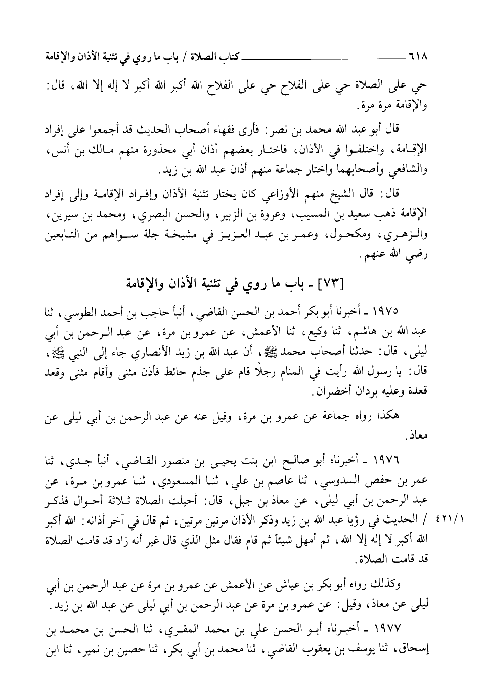 1975 - أَخْبَرَنَا أَبُو بَكْرٍ أَحْمَدُ بْنُ الْحَسَنِ الْقَاضِي أنبأ حَاجِبُ بْنُ أَحْمَدَ الطُّوسِيُّ ثنا عَبْدُ اللهِ بْنُ هَاشِمٍ ثنا وَكِيعٌ ثنا الْأَعْمَشُ عَنْ عَمْرِو بْنِ مُرَّةَ عَنْ عَبْدِ الرَّحْمَنِ بْنِ أَبِي لَيْلَى، قَالَ: حَدَّثَنَا أَصْحَابُ مُحَمَّدٍ صَلَّى اللهُ عَلَيْهِ وَسَلَّمَ أَنَّ عَبْدَ اللهِ بْنَ زَيْدٍ الْأَنْصَارِيَّ جَاءَ إِلَى النَّبِيِّ صَلَّى اللهُ عَلَيْهِ وَسَلَّمَ قَالَ: يَا رَسُولَ اللهِ: §" رَأَيْتُ فِي الْمَنَامِ رَجُلًا قَامَ عَلَى جِذْمِ حَائِطٍ فَأَذَّنَ مَثْنَى وَأَقَامَ مَثْنَى وَقَعَدَ قَعْدَةً وَعَلَيْهِ بُرْدَانِ أَخْضَرَانِ " هَكَذَا رَوَاهُ جَمَاعَةٌ عَنْ عَمْرِو بْنِ مُرَّةَ وَقِيلَ: عَنْهُ، عَنْ عَبْدِ الرَّحْمَنِ بْنِ أَبِي لَيْلَى، عَنْ مُعَاذٍ