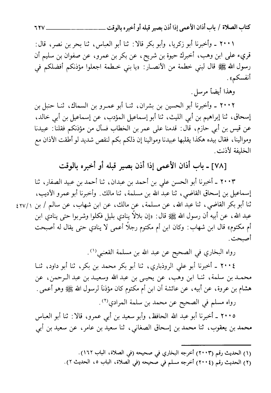 2004 - أَخْبَرَنَا أَبُو عَلِيٍّ الرُّوذْبَارِيُّ ثنا أَبُو بَكْرٍ مُحَمَّدُ بْنُ بَكْرٍ، ثنا أَبُو دَاوُدَ ثنا مُحَمَّدُ بْنُ سَلَمَةَ ثنا ابْنُ وَهْبٍ عَنْ يَحْيَى بْنِ عَبْدِ اللهِ وَسَعِيدِ بْنِ عَبْدِ الرَّحْمَنِ عَنْ هِشَامِ بْنِ عُرْوَةَ عَنْ أَبِيهِ عَنْ عَائِشَةَ أَنَّ ابْنَ أُمِّ مَكْتُومٍ كَانَ §مُؤَذِّنًا لِرَسُولِ اللهِ صَلَّى اللهُ عَلَيْهِ وَسَلَّمَ وَهُوَ أَعْمَى " رَوَاهُ مُسْلِمٌ فِي الصَّحِيحِ، عَنْ مُحَمَّدِ بْنِ سَلَمَةَ الْمُرَادِيِّ