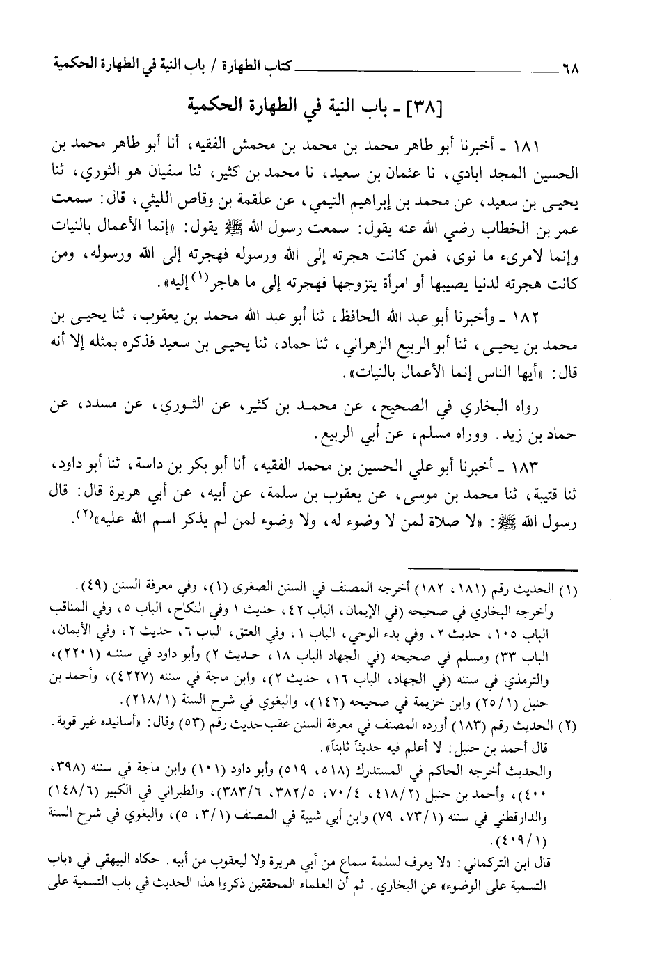 181 - أَخْبَرَنَا أَبُو طَاهِرٍ مُحَمَّدُ بْنُ مُحَمَّدِ بْنِ مُحَمَّشٍ الْفَقِيهُ، أنا أَبُو طَاهِرٍ مُحَمَّدُ بْنُ الْحُسَيْنِ الْمَجْدَ آبَادِيُّ، نا عُثْمَانُ بْنُ سَعِيدٍ، نا مُحَمَّدُ بْنُ كَثِيرٍ، ثنا سُفْيَانُ هُوَ الثَّوْرِيُّ، ثنا يَحْيَى بْنُ سَعِيدٍ، عَنْ مُحَمَّدِ بْنِ إِبْرَاهِيمَ التَّيْمِيِّ، عَنْ عَلْقَمَةَ بْنِ وَقَاصٍ اللَّيْثِيِّ، قَالَ: سَمِعْتُ عُمَرَ بْنَ الْخَطَّابِ رَضِيَ اللهُ عَنْهُ، يَقُولُ: سَمِعْتُ رَسُولَ اللهِ صَلَّى اللهُ عَلَيْهِ وَسَلَّمَ يَقُولُ: " §إِنَّمَا الْأَعْمَالُ بِالنِّيَّاتِ، وَإِنَّمَا لِامْرِئٍ مَا نَوَى، فَمَنْ كَانَتْ هِجْرَتُهُ إِلَى اللهِ وَرَسُولِهِ فَهِجْرَتُهُ إِلَى اللهِ وَرَسُولِهِ، وَمَنْ كَانَتْ هِجْرَتُهُ لِدُنْيَا يُصِيبُهَا أَوِ امْرَأَةٍ يَتَزَوَّجُهَا فَهِجْرَتُهُ إِلَى مَا هَاجَرَ إِلَيْهِ "