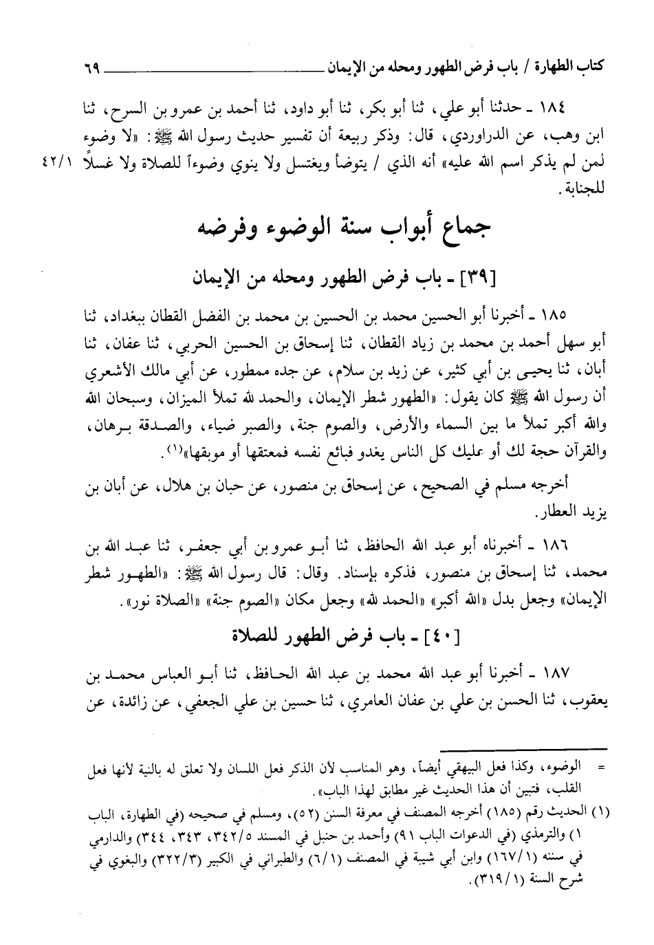 185 - أَخْبَرَنَا أَبُو الْحُسَيْنِ مُحَمَّدُ بْنُ الْحُسَيْنِ بْنِ مُحَمَّدِ بْنِ الْفَضْلِ الْقَطَّانُ بِبَغْدَادَ، ثنا أَبُو سَهْلٍ أَحْمَدُ بْنُ مُحَمَّدِ بْنِ زِيَادٍ الْقَطَّانُ، ثنا إِسْحَاقُ بْنُ الْحُسَيْنِ الْحَرْبِيُّ، ثنا عَفَّانُ، ثنا أَبَانُ، ثنا يَحْيَى بْنُ أَبِي كَثِيرٍ، عَنْ زَيْدِ بْنِ سَلَّامٍ، عَنْ جَدِّهِ مَمْطُورٍ، عَنْ أَبِي مَالِكٍ الْأَشْعَرِيِّ، أَنَّ رَسُولَ اللهِ صَلَّى اللهُ عَلَيْهِ وَسَلَّمَ كَانَ يَقُولُ: " §الطُّهُورُ شَطْرُ الْإِيمَانِ، وَالْحَمْدُ لِلَّهِ تَمْلَأُ الْمِيزَانَ، وَسُبْحَانَ اللهِ وَاللهُ أَكْبَرُ تَمْلَأُ مَا بَيْنَ السَّمَاءِ وَالْأَرْضِ، وَالصَّوْمُ جُنَّةٌ، وَالصَّبْرُ ضِيَاءٌ، وَالصَّدَقَةُ بُرْهَانٌ، وَالْقُرْآنُ حُجَّةٌ لَكَ أَوْ عَلَيْكَ، كُلُّ النَّاسِ يَغْدُو فَبَائِعٌ نَفْسَهُ فَمُعْتِقُهَا أَوْ مُوبِقُهَا ". أَخْرَجَهُ مُسْلِمٌ فِي الصَّحِيحِ، عَنْ إِسْحَاقَ بْنِ مَنْصُورٍ، عَنْ حِبَّانَ بْنِ هِلَالٍ، عَنْ أَبَانَ بْنِ يَزِيدَ الْعَطَّارِ