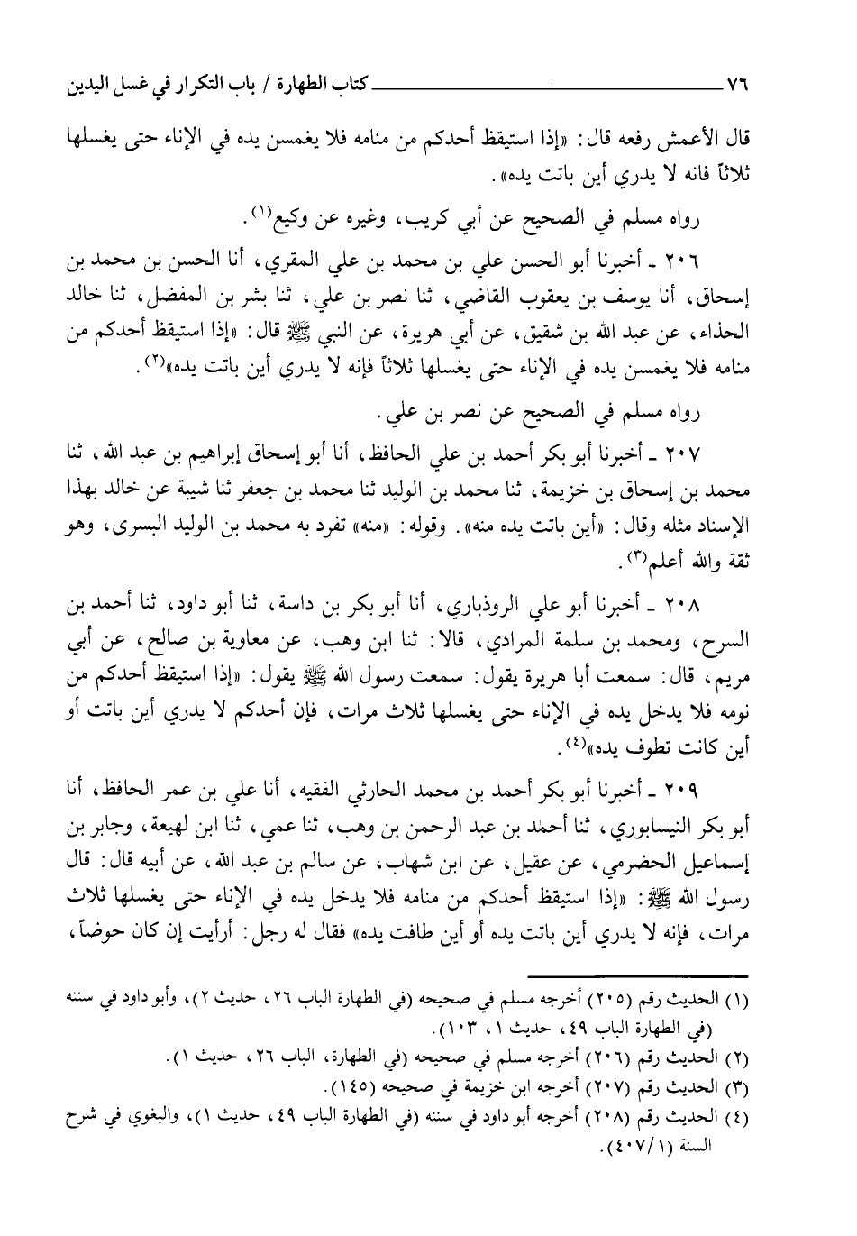 206 - أَخْبَرَنَا أَبُو الْحَسَنِ عَلِيُّ بْنُ مُحَمَّدِ بْنِ عَلِيٍّ الْمُقْرِئُ، أنا الْحَسَنُ بْنُ مُحَمَّدِ بْنِ إِسْحَاقَ، أنا يُوسُفُ بْنُ يَعْقُوبَ الْقَاضِي، ثنا نَصْرُ بْنُ عَلِيٍّ، ثنا بِشْرُ بْنُ الْمُفَضَّلِ، ثنا خَالِدٌ الْحَذَّاءُ، عَنْ عَبْدِ اللهِ بْنِ شَقِيقٍ، عَنْ أَبِي هُرَيْرَةَ، عَنِ النَّبِيِّ صَلَّى اللهُ عَلَيْهِ وَسَلَّمَ قَالَ: §" إِذَا اسْتَيْقَظَ أَحَدُكُمْ مِنْ مَنَامِهِ فَلَا يَغْمِسْ يَدَهُ فِي الْإِنَاءِ حَتَّى يَغْسِلَهَا ثَلَاثًا؛ فَإِنَّهُ لَا يَدْرِي أَيْنَ بَاتَتْ يَدُهُ ". رَوَاهُ مُسْلِمٌ فِي الصَّحِيحِ، عَنْ نَصْرِ بْنِ عَلِيٍّ