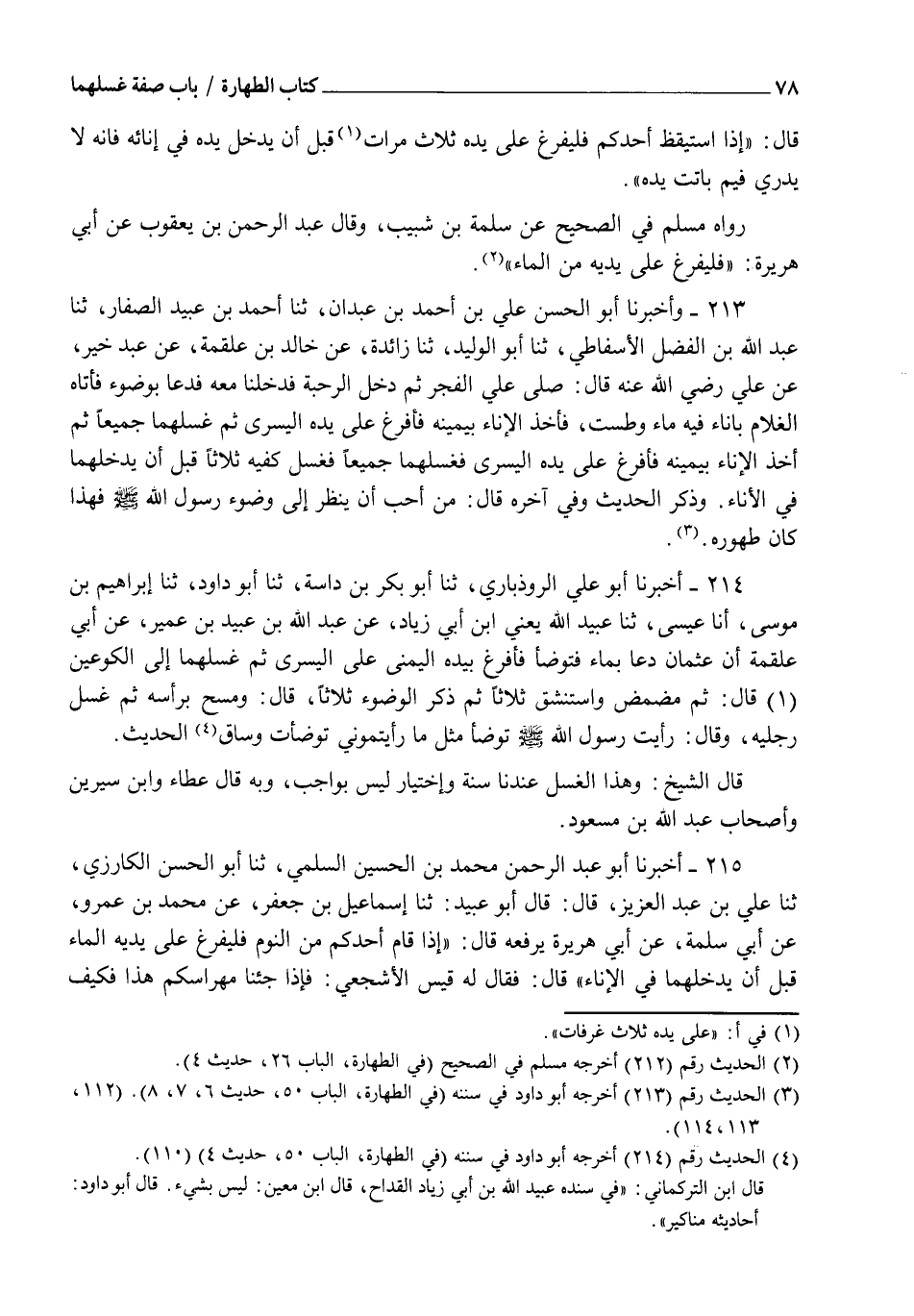 213 - وَأَخْبَرَنَا أَبُو الْحَسَنِ عَلِيُّ بْنُ أَحْمَدَ بْنِ عَبْدَانَ، ثنا أَحْمَدُ بْنُ عُبَيْدٍ الصَّفَّارُ، ثنا عَبَّاسُ بْنُ الْفَضْلِ الْأَسْفَاطِيُّ، ثنا أَبُو الْوَلِيدِ، ثنا زَائِدَةُ، عَنْ خَالِدِ بْنِ عَلْقَمَةَ، عَنْ عَبْدِ خَيْرٍ، عَنْ عَلِيٍّ رَضِيَ اللهُ عَنْهُ، قَالَ: صَلَّى عَلِيٌّ الْفَجْرَ، ثُمَّ دَخَلَ الرَّحَبَةَ فَدَخَلْنَا مَعَهُ، فَدَعَا بِوَضُوءٍ، فَأَتَاهُ الْغُلَامُ بِإِنَاءٍ فِيهِ مَاءٌ وَطَسْتٍ، §فَأَخَذَ الْإِنَاءَ بِيَمِينِهِ فَأَفْرَغَ عَلَى يَدِهِ الْيُسْرَى، ثُمَّ غَسَلَهُمَا جَمِيعًا، ثُمَّ أَخَذَ الْإِنَاءَ بِيَمِينِهِ فَأَفْرَغَ عَلَى يَدِهِ الْيُسْرَى فَغَسَلَهُمَا جَمِيعًا، فَغَسَلَ كَفَّيْهِ ثَلَاثًا قَبْلَ أَنْ يُدْخِلَهُمَا فِي الْإِنَاءِ وَذَكَرَ الْحَدِيثَ. وَفِي آخِرِهِ قَالَ: " مَنْ أَحَبَّ أَنْ يَنْظُرَ إِلَى وُضُوءِ رَسُولِ اللهِ صَلَّى اللهُ عَلَيْهِ وَسَلَّمَ فَهَذَا كَانَ طُهُورَهُ "