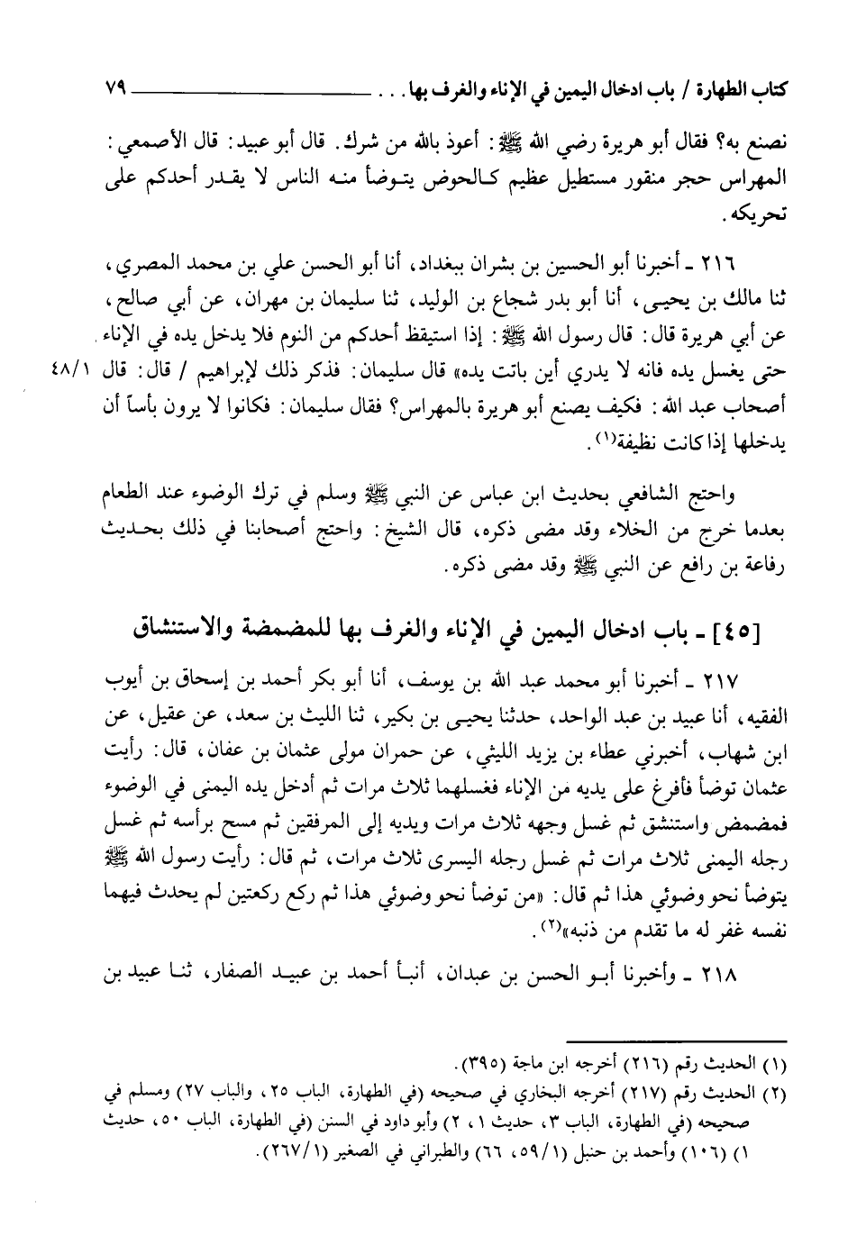 217 - أَخْبَرَنَا أَبُو مُحَمَّدٍ عَبْدُ اللهِ بْنُ يُوسُفَ، أنا أَبُو بَكْرٍ أَحْمَدُ بْنُ إِسْحَاقَ بْنِ أَيُّوبَ الْفَقِيهُ، أنا عُبَيْدُ بْنُ عَبْدِ الْوَاحِدِ، ثنا يَحْيَى بْنُ بُكَيْرٍ، ثنا اللَّيْثُ بْنُ سَعْدٍ، عَنْ عُقَيْلٍ، عَنِ ابْنِ شِهَابٍ، أَخْبَرَنِي عَطَاءُ بْنُ يَزِيدَ اللَّيْثِيُّ، عَنْ حُمْرَانَ، مَوْلَى عُثْمَانَ بْنِ عَفَّانَ قَالَ: رَأَيْتُ عُثْمَانَ تَوَضَّأَ، فَأَفْرَغَ عَلَى يَدَيْهِ مِنَ الْإِنَاءِ فَغَسَلَهُمَا ثَلَاثَ مَرَّاتٍ، ثُمَّ أَدْخَلَ يَدَهُ الْيُمْنَى فِي الْوَضُوءِ فَمَضْمَضَ وَاسْتَنْشَقَ، ثُمَّ غَسَلَ وَجْهَهُ ثَلَاثَ مَرَّاتٍ وَيَدَيْهِ إِلَى الْمِرْفَقَيْنِ، ثُمَّ مَسَحَ بِرَأْسِهِ ثُمَّ غَسَلَ رِجْلَهُ الْيُمْنَى ثَلَاثَ مَرَّاتٍ، ثُمَّ غَسَلَ رِجْلَهُ الْيُسْرَى ثَلَاثَ مَرَّاتٍ، ثُمَّ قَالَ: رَأَيْتُ رَسُولَ اللهِ صَلَّى اللهُ عَلَيْهِ وَسَلَّمَ يَتَوَضَّأُ نَحْوَ وُضُوئِي هَذَا، ثُمَّ قَالَ: §" مَنْ تَوَضَّأَ نَحْوَ وُضُوئِي هَذَا ثُمَّ رَكَعَ رَكْعَتَيْنِ لَمْ يُحَدِّثْ فِيهِمَا نَفْسَهُ غُفِرَ لَهُ مَا تَقَدَّمَ مِنْ ذَنْبِهِ "