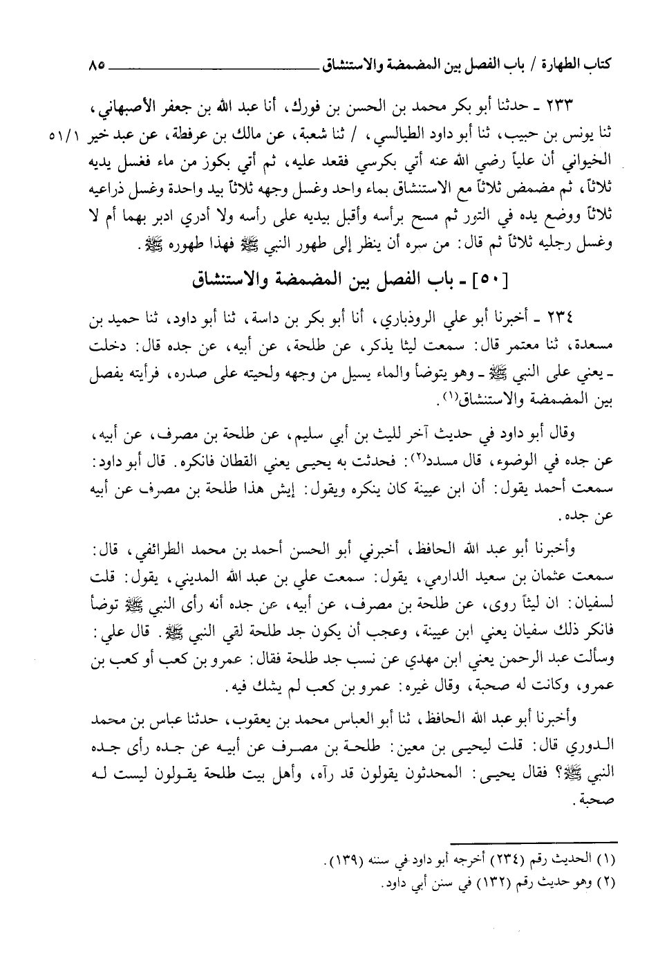 234 - أَخْبَرَنَا أَبُو عَلِيٍّ الرُّوذْبَارِيُّ، أنا أَبُو بَكْرِ بْنُ دَاسَةَ، ثنا أَبُو دَاوُدَ، ثنا حُمَيْدُ بْنُ مَسْعَدَةَ، ثنا مُعْتَمِرٌ، قَالَ: سَمِعْتُ لَيْثًا، يَذْكُرُ عَنْ طَلْحَةَ، عَنْ أَبِيهِ، عَنْ جَدِّهِ، قَالَ: " دَخَلْتُ يَعْنِي عَلَى النَّبِيِّ صَلَّى اللهُ عَلَيْهِ وَسَلَّمَ وَهُوَ يَتَوَضَّأُ وَالْمَاءُ يَسِيلُ مِنْ وَجْهِهِ وَلِحْيَتِهِ عَلَى صَدْرِهِ، فَرَأَيْتُهُ §يَفْصِلُ بَيْنَ الْمَضْمَضَةِ وَالِاسْتِنْشَاقِ ". وَقَالَ أَبُو دَاوُدَ، فِي حَدِيثٍ آخَرَ لِلَّيْثِ بْنِ أَبِي سُلَيْمٍ، عَنْ طَلْحَةَ بْنِ مُصَرِّفٍ، عَنْ أَبِيهِ، عَنْ جَدِّهِ فِي الْوُضُوءِ، قَالَ مُسَدَّدٌ: فَحَدَّثْتُ بِهِ يَحْيَى يَعْنِي الْقَطَّانَ، فَأَنْكَرَهُ. قَالَ أَبُو دَاوُدَ: سَمِعْتُ أَحْمَدَ، يَقُولُ: إِنَّ ابْنَ عُيَيْنَةَ كَانَ يُنْكِرُهُ وَيَقُولُ: أَيْشْ هَذَا طَلْحَةُ بْنُ مُصَرِّفٍ، عَنْ أَبِيهِ، عَنْ جَدِّهِ. وَأَخْبَرَنَا أَبُو عَبْدِ اللهِ الْحَافِظُ، أَخْبَرَنِي أَبُو الْحَسَنِ أَحْمَدُ بْنُ مُحَمَّدٍ الطَّرَائِفِيُّ: قَالَ: سَمِعْتُ عُثْمَانَ بْنَ سَعِيدٍ الدَّارِمِيَّ، يَقُولُ: سَمِعْتُ عَلِيَّ بْنَ عَبْدِ اللهِ الْمَدِينِيَّ، يَقُولُ: قُلْتُ لِسُفْيَانَ: إِنَّ لَيْثًا رَوَى عَنْ طَلْحَةَ بْنِ مُصَرِّفٍ، عَنْ أَبِيهِ، عَنْ جَدِّهِ أَنَّهُ رَأَى النَّبِيَّ صَلَّى اللهُ عَلَيْهِ وَسَلَّمَ تَوَضَّأَ فَأَنْكَرَ ذَلِكَ سُفْيَانُ يَعْنِي ابْنَ عُيَيْنَةَ وَعَجِبَ أَنْ يَكُونَ جَدُّ طَلْحَةَ لَقِيَ النَّبِيَّ صَلَّى اللهُ عَلَيْهِ وَسَلَّمَ. قَالَ عَلِيٌّ: وَسَأَلْتُ عَبْدَ الرَّحْمَنِ يَعْنِي ابْنَ مَهْدِيٍّ، عَنْ نَسَبِ جَدِّ طَلْحَةَ، فَقَالَ: عَمْرُو بْنُ كَعْبٍ، أَوْ كَعْبُ بْنُ عَمْرٍو وَكَانَتْ لَهُ صُحْبَةٌ. وَقَالَ غَيْرُهُ: عَمْرُو بْنُ كَعْبٍ لَمْ يُشَكَّ فِيهِ. وَأَخْبَرَنَا أَبُو عَبْدِ اللهِ الْحَافِظُ، ثنا أَبُو الْعَبَّاسُ مُحَمَّدُ بْنُ يَعْقُوبَ، حَدَّثَنَا عَبَّاسُ بْنُ مُحَمَّدٍ الدُّورِيُّ قَالَ: قُلْتُ لِيَحْيَى بْنِ مَعِينٍ طَلْحَةُ بْنُ مُصَرِّفٍ، عَنْ أَبِيهِ، عَنْ جَدِّهِ: رَأَى جَدُّهُ النَّبِيَّ صَلَّى اللهُ عَلَيْهِ وَسَلَّمَ؟ فَقَالَ يَحْيَى: الْمُحَدِّثُونَ يَقُولُونَ: قَدْ رَآهُ، وَأَهْلُ بَيْتِ طَلْحَةَ يَقُولُونَ: لَيْسَتْ لَهُ صُحْبَةٌ