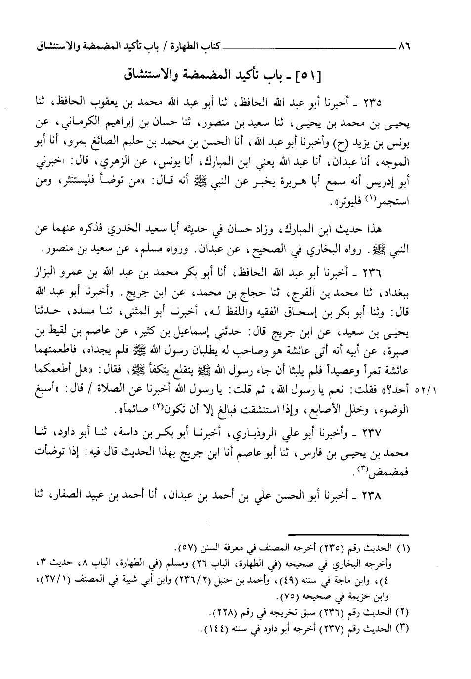 235 - أَخْبَرَنَا أَبُو عَبْدِ اللهِ الْحَافِظُ، ثنا أَبُو عَبْدِ اللهِ مُحَمَّدُ بْنُ يَعْقُوبَ الْحَافِظُ، ثنا يَحْيَى بْنُ مُحَمَّدِ بْنِ يَحْيَى، ثنا سَعِيدُ بْنُ مَنْصُورٍ، ثنا حَسَّانُ بْنُ إِبْرَاهِيمَ الْكِرْمَانِيُّ، عَنْ يُونُسَ بْنِ يَزِيدَ، ح. وَأَخْبَرَنَا أَبُو عَبْدِ اللهِ، أنا الْحَسَنُ بْنُ مُحَمَّدِ بْنِ حَلِيمٍ الصَّائِغُ بِمَرْوَ، أنا أَبُو الْمُوَجَّهِ، أنا عَبْدَانُ، أنا عَبْدُ اللهِ يَعْنِي ابْنَ الْمُبَارَكِ، أنا يُونُسُ، عَنِ الزُّهْرِيِّ، قَالَ: أَخْبَرَنِي أَبُو إِدْرِيسَ، أَنَّهُ سَمِعَ أَبَا هُرَيْرَةَ يُخْبِرُ عَنِ النَّبِيِّ صَلَّى اللهُ عَلَيْهِ وَسَلَّمَ أَنَّهُ قَالَ: §" مَنْ تَوَضَّأَ فَلْيَسْتَنْثِرْ، وَمَنِ اسْتَجْمَرَ فَلْيُوتِرْ ". هَذَا حَدِيثُ ابْنِ الْمُبَارَكِ، وَزَادَ حَسَّانُ فِي حَدِيثِهِ، أَبَا سَعِيدٍ الْخُدْرِيَّ، فَذَكَرَهُ عَنْهُمَا، عَنِ النَّبِيِّ صَلَّى اللهُ عَلَيْهِ وَسَلَّمَ. رَوَاهُ الْبُخَارِيُّ فِي الصَّحِيحِ، عَنْ عَبْدَانَ، وَرَوَاهُ مُسْلِمٌ، عَنْ سَعِيدِ بْنِ مَنْصُورٍ