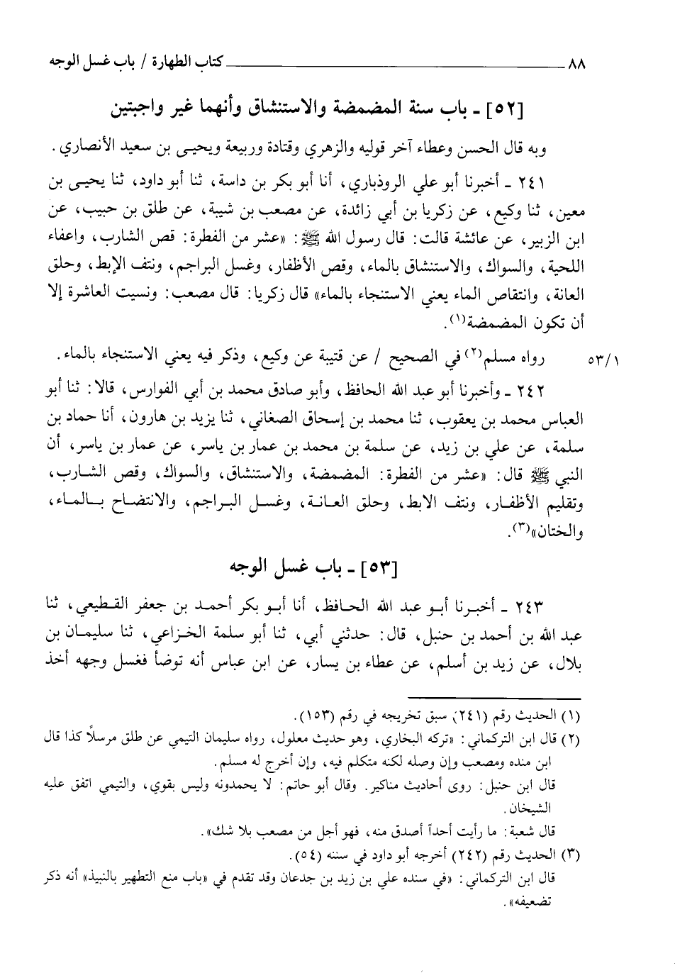 241 - أَخْبَرَنَا أَبُو عَلِيٍّ الرُّوذْبَارِيُّ، أنا أَبُو بَكْرِ بْنُ دَاسَةَ، ثنا أَبُو دَاوُدَ، ثنا يَحْيَى بْنُ مَعِينٍ، ثنا وَكِيعٌ، عَنْ زَكَرِيَّا بْنِ أَبِي زَائِدَةَ، عَنْ مُصْعَبِ بْنِ شَيْبَةَ، عَنْ طَلْقِ بْنِ حَبِيبٍ، عَنِ ابْنِ الزُّبَيْرِ، عَنْ عَائِشَةَ، قَالَتْ: قَالَ رَسُولُ اللهِ صَلَّى اللهُ عَلَيْهِ وَسَلَّمَ: " §عَشْرٌ مِنَ الْفِطْرَةِ: قَصُّ الشَّارِبِ، وَإِعْفَاءُ اللِّحْيَةِ، وَالسِّوَاكُ، وَالِاسْتِنْشَاقُ بِالْمَاءِ، وَقَصُّ الْأَظْفَارِ، وَغَسْلُ الْبَرَاجِمِ، وَنَتْفُ الْإِبْطِ، وَحَلْقُ الْعَانَةِ، وَانْتِقَاصُ الْمَاءِ يَعْنِي الِاسْتِنْجَاءَ بِالْمَاءِ ". قَالَ زَكَرِيَّا: قَالَ مُصْعَبٌ: " وَنَسِيتُ الْعَاشِرَةَ إِلَّا أَنْ تَكُونَ الْمَضْمَضَةَ ". رَوَاهُ مُسْلِمٌ فِي الصَّحِيحِ، عَنْ قُتَيْبَةَ، عَنْ وَكِيعٍ، وَذَكَرَ فِيهِ يَعْنِي الِاسْتِنْجَاءَ بِالْمَاءِ