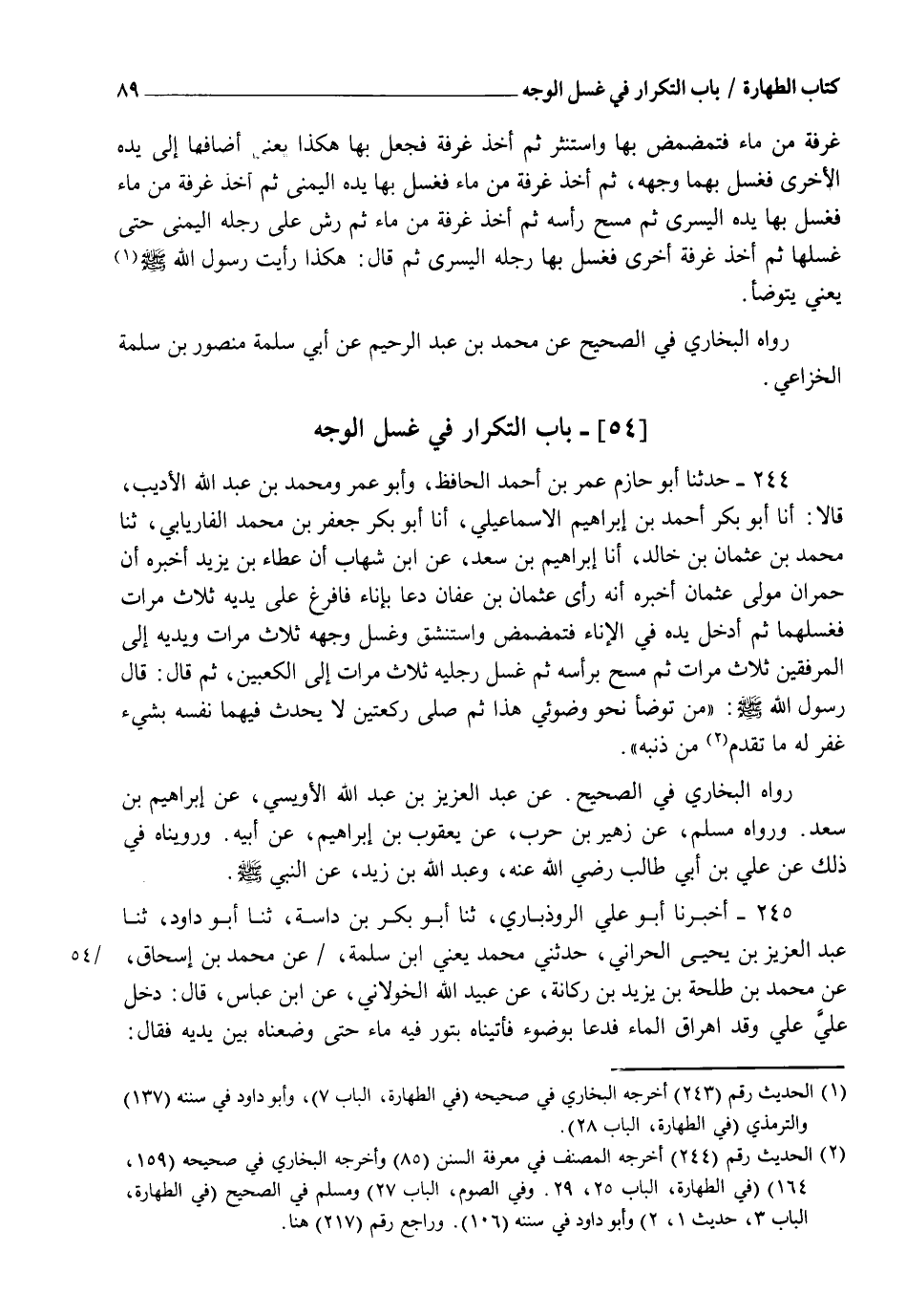 244 - حَدَّثَنَا أَبُو حَازِمٍ عُمَرُ بْنُ أَحْمَدَ الْحَافِظُ، وَأَبُو عَمْرٍو مُحَمَّدُ بْنُ عَبْدِ اللهِ الْأَدِيبُ، قَالَا: أنا أَبُو بَكْرٍ أَحْمَدُ بْنُ إِبْرَاهِيمَ الْإِسْمَاعِيلِيُّ، أنا أَبُو بَكْرٍ جَعْفَرُ بْنُ مُحَمَّدٍ الْفِرْيَابِيُّ، ثنا مُحَمَّدُ بْنُ عُثْمَانَ بْنِ خَالِدٍ، أنا إِبْرَاهِيمُ بْنُ سَعْدٍ، عَنِ ابْنِ شِهَابٍ، أَنَّ عَطَاءَ بْنَ يَزِيدَ، أَخْبَرَهُ، أَنَّ حُمْرَانَ مَوْلَى عُثْمَانَ، أَخْبَرَهُ أَنَّهُ رَأَى عُثْمَانَ بْنِ عَفَّانَ دَعَا بِإِنَاءٍ، فَأَفْرَغَ عَلَى يَدَيْهِ ثَلَاثَ مَرَّاتٍ، فَغَسَلَهُمَا، ثُمَّ أَدْخَلَ يَدَهُ فِي الْإِنَاءِ فَتَمَضْمَضَ وَاسْتَنْشَقَ، وَغَسَلَ وَجْهَهُ ثَلَاثَ مَرَّاتٍ وَيَدَيْهِ إِلَى الْمِرْفَقَيْنِ ثَلَاثَ مَرَّاتٍ فَغَسَلَهُمَا، ثُمَّ أَدْخَلَ يَدَهُ فِي الْإِنَاءِ فَتَمَضْمَضَ وَاسْتَنْشَقَ، وَغَسَلَ وَجْهَهُ ثَلَاثَ مَرَّاتٍ وَيَدَيْهِ إِلَى الْمِرْفَقَيْنِ ثَلَاثَ مَرَّاتٍ، ثُمَّ مَسَحَ بِرَأْسِهِ، ثُمَّ غَسَلَ رِجْلَيْهِ ثَلَاثَ مَرَّاتٍ إِلَى الْكَعْبَيْنِ، ثُمَّ قَالَ: قَالَ رَسُولُ اللهِ صَلَّى اللهُ عَلَيْهِ وَسَلَّمَ: " §مَنْ تَوَضَّأَ نَحْوَ وُضُوئِي هَذَا، ثُمَّ صَلَّى رَكْعَتَيْنِ لَا يُحَدِّثُ فِيهِمَا نَفْسَهُ بِشَيْءٍ غُفِرَ لَهُ مَا تَقَدَّمَ مِنْ ذَنْبِهِ ". رَوَاهُ الْبُخَارِيُّ فِي الصَّحِيحِ، عَنْ عَبْدِ الْعَزِيزِ بْنِ عَبْدِ اللهِ الْأُوَيْسِيُّ، عَنْ إِبْرَاهِيمَ بْنِ سَعْدٍ. وَرَوَاهُ مُسْلِمٌ، عَنْ زُهَيْرِ بْنِ حَرْبٍ، عَنْ يَعْقُوبَ بْنِ إِبْرَاهِيمَ، عَنْ أَبِيهِ، وَرُوِّينَاهُ فِي ذَلِكَ، عَنْ عَلِيِّ بْنِ أَبِي طَالِبٍ رَضِيَ اللهُ عَنْهُ، وَعَبْدُ اللهِ بْنُ زَيْدٍ، عَنِ النَّبِيِّ صَلَّى اللهُ عَلَيْهِ وَسَلَّمَ