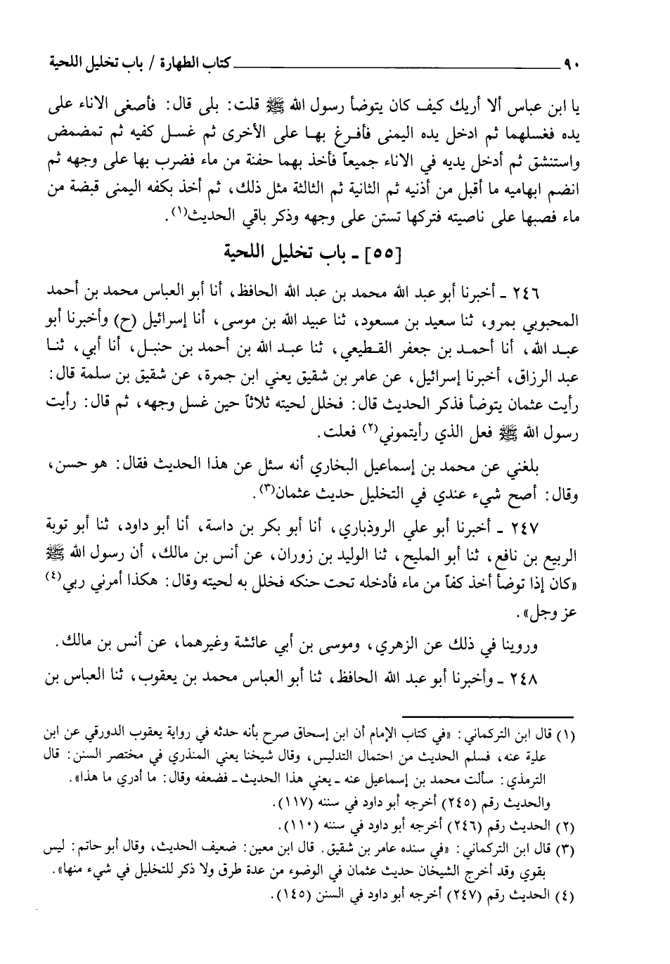 246 - أَخْبَرَنَا أَبُو عَبْدِ اللهِ مُحَمَّدُ بْنُ عَبْدِ اللهِ الْحَافِظُ، أنا أَبُو الْعَبَّاسِ مُحَمَّدُ بْنُ أَحْمَدَ الْمَحْبُوبِيُّ بِمَرْوَ، ثنا سَعِيدُ بْنُ مَسْعُودٍ، ثنا عُبَيْدُ اللهِ بْنُ مُوسَى، أنا إِسْرَائِيلُ، ح. وَأَخْبَرَنَا أَبُو عَبْدِ اللهِ، أنا أَحْمَدُ بْنُ جَعْفَرٍ الْقَطِيعِيُّ، ثنا عَبْدُ اللهِ بْنُ أَحْمَدَ بْنِ حَنْبَلٍ، أنا أَبِي، ثنا عَبْدُ الرَّزَّاقِ، أَخْبَرَنَا إِسْرَائِيلُ، عَنْ عَامِرِ بْنِ شَقِيقٍ يَعْنِي ابْنَ جَمْرَةَ، عَنْ شَقِيقِ بْنِ سَلَمَةَ، قَالَ: رَأَيْتُ عُثْمَانَ تَوَضَّأَ، فَذَكَرَ الْحَدِيثَ، قَالَ: §فَخَلَّلَ لِحْيَتَهُ ثَلَاثًا حِينَ غَسَلَ وَجْهَهُ، ثُمَّ قَالَ: " رَأَيْتُ رَسُولَ اللهِ صَلَّى اللهُ عَلَيْهِ وَسَلَّمَ فَعَلَ الَّذِي رَأَيْتُمُونِي فَعَلْتُ ". بَلَغَنِي عَنْ مُحَمَّدِ بْنِ إِسْمَاعِيلَ الْبُخَارِيِّ، أَنَّهُ سُئِلَ عَنْ هَذَا الْحَدِيثِ فَقَالَ: هُوَ حَسَنٌ. وَقَالَ: أَصَحُّ شَيْءٍ عِنْدِي فِي التَّخْلِيلِ حَدِيثُ عُثْمَانَ
