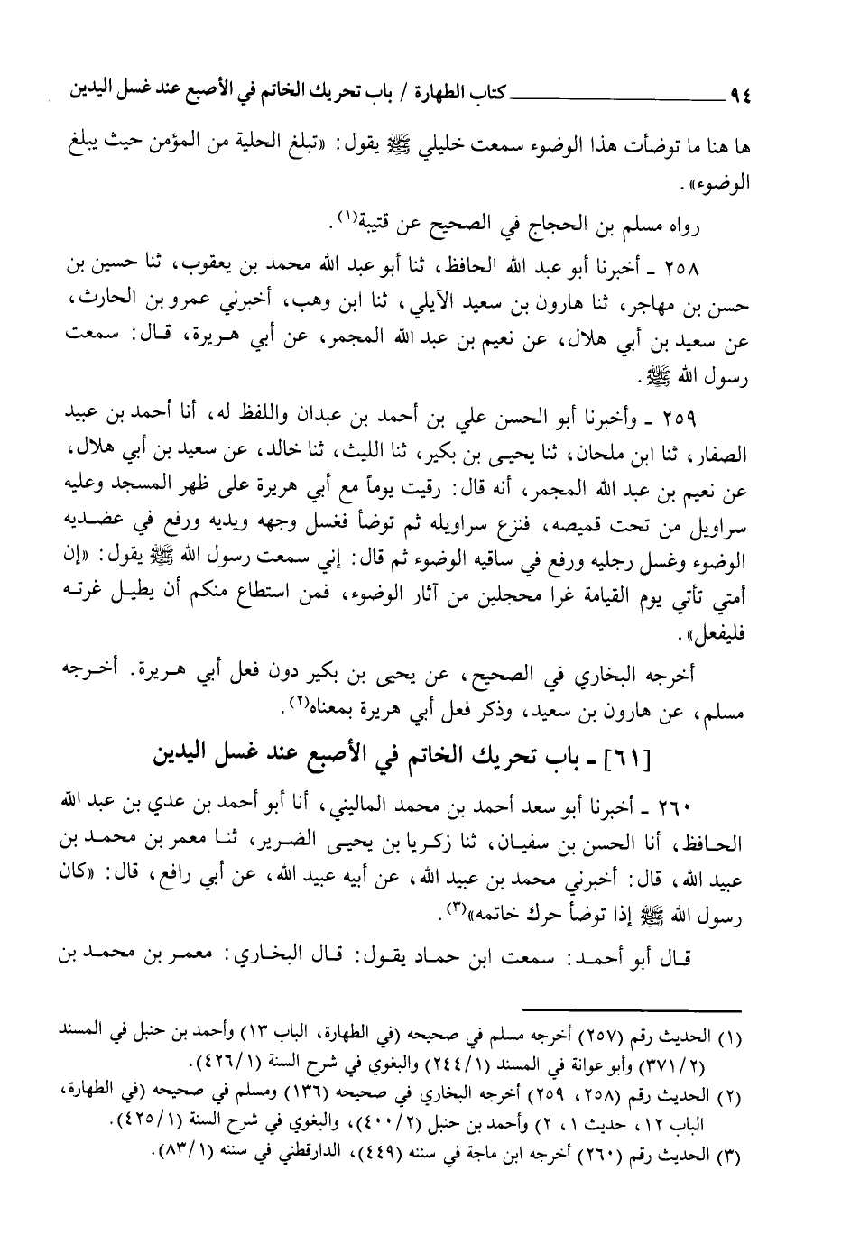 259 - وَأَخْبَرَنَا أَبُو الْحَسَنِ عَلِيُّ بْنُ أَحْمَدَ بْنِ عَبْدَانَ وَاللَّفْظُ لَهُ، أنا أَحْمَدُ بْنُ عُبَيْدٍ الصَّفَّارُ، ثنا ابْنُ مَلْحَانَ، ثنا يَحْيَى بْنُ بُكَيْرٍ، ثنا اللَّيْثُ، ثنا خَالِدٌ، عَنْ سَعِيدِ بْنِ أَبِي هِلَالٍ، عَنْ نُعَيْمِ بْنِ عَبْدِ اللهِ الْمُجْمِرِ، أَنَّهُ قَالَ: رَقِيتُ يَوْمًا مَعَ أَبِي هُرَيْرَةَ عَلَى ظَهْرِ الْمَسْجِدِ وَعَلَيْهِ سَرَاوِيلُ مِنْ تَحْتِ قَمِيصِهِ، فَنَزَعَ سَرَاوِيلَهُ، ثُمَّ تَوَضَّأَ، فَغَسَلَ وَجْهَهُ وَيَدَيْهِ وَرَفَعَ فِي عَضُدَيْهِ الْوَضُوءَ، وَغَسَلَ رِجْلَيْهِ وَرَفَعَ فِي سَاقَيْهِ الْوَضُوءَ، ثُمَّ قَالَ: إِنِّي سَمِعْتُ رَسُولَ اللهِ صَلَّى اللهُ عَلَيْهِ وَسَلَّمَ يَقُولُ: " إِنَّ §أُمَّتِي تَأْتِي يَوْمَ الْقِيَامَةِ غُرًّا مُحَجَّلِينَ مِنْ آثَارِ الْوُضُوءِ، فَمَنِ اسْتَطَاعَ مِنْكُمْ أَنْ يُطِيلَ غُرَّتَهُ فَلْيَفْعَلْ ". أَخْرَجَهُ الْبُخَارِيُّ فِي الصَّحِيحِ، عَنْ يَحْيَى بْنِ بُكَيْرٍ دُونَ فِعْلِ أَبِي هُرَيْرَةَ. أَخْرَجَهُ مُسْلِمٌ، عَنْ هَارُونَ بْنِ سَعِيدٍ، وَذَكَرَ فِعْلَ أَبِي هُرَيْرَةَ بِمَعْنَاهُ