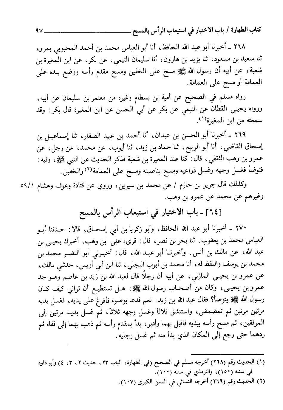 269 - أَخْبَرَنَا أَبُو الْحَسَنِ بْنُ عَبْدَانَ، أنا أَحْمَدُ بْنُ عُبَيْدٍ الصَّفَّارُ، ثنا إِسْمَاعِيلُ بْنُ إِسْحَاقَ الْقَاضِي، أنا أَبُو الرَّبِيعِ، ثنا حَمَّادُ بْنُ زَيْدٍ، ثنا أَيُّوبُ، عَنْ مُحَمَّدٍ، عَنْ رَجُلٍ، عَنْ عَمْرِو بْنِ وَهْبٍ الثَّقَفِيِّ، قَالَ: كُنَّا عِنْدَ الْمُغِيرَةِ بْنِ شُعْبَةَ، فَذَكَرَ الْحَدِيثَ عَنِ النَّبِيِّ صَلَّى اللهُ عَلَيْهِ وَسَلَّمَ، وَفِيهِ: §فَتَوَضَّأَ فَغَسَلَ وَجْهَهُ، وَغَسَلَ ذِرَاعَيْهِ، وَمَسَحَ بِنَاصِيَتِهِ، وَمَسَحَ عَلَى الْعِمَامَةِ وَالْخُفَّيْنِ "، وَكَذَلِكَ قَالَ جَرِيرُ بْنُ حَازِمٍ، عَنْ مُحَمَّدِ بْنِ سِيرِينَ، وَرُوِيَ عَنْ قَتَادَةَ، وَعَوْفٍ، وَهِشَامٍ وَغَيْرِهِمْ، عَنْ مُحَمَّدٍ، عَنْ عَمْرِو بْنِ وَهْبٍ