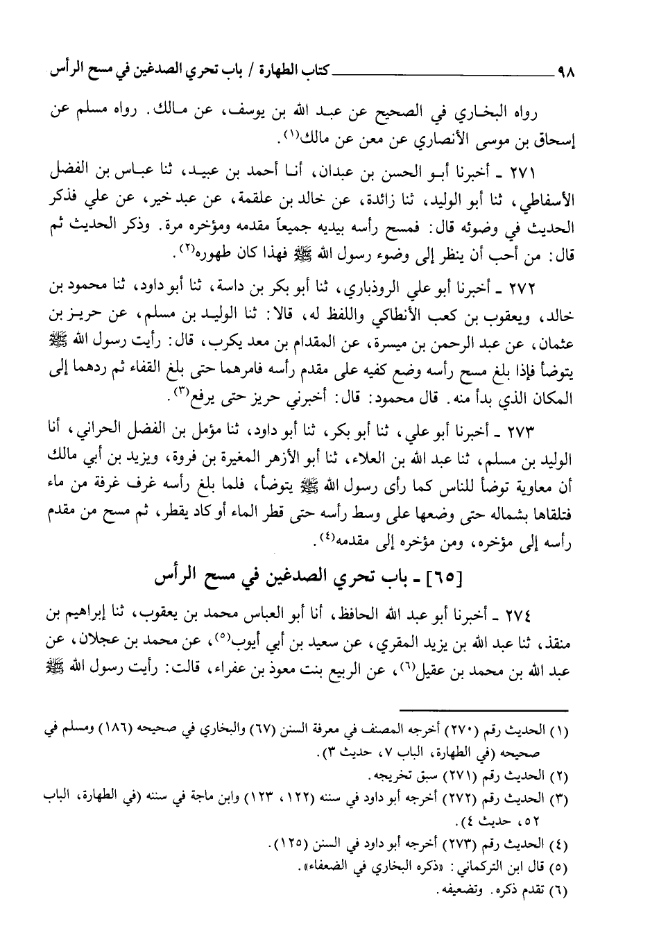 273 - أَخْبَرَنَا أَبُو عَلِيٍّ، ثنا أَبُو بَكْرٍ، ثنا أَبُو دَاوُدَ، ثنا مُؤَمَّلُ بْنُ الْفَضْلِ الْحَرَّانِيُّ، أنا الْوَلِيدُ بْنُ مُسْلِمٍ، ثنا عَبْدُ اللهِ بْنُ الْعَلَاءِ، ثنا أَبُو الْأَزْهَرِ الْمُغِيرَةُ بْنُ فَرْوَةَ، وَيَزِيدُ بْنُ أَبِي مَالِكٍ، أَنَّ مُعَاوِيَةَ " تَوَضَّأَ لِلنَّاسِ كَمَا رَأَى رَسُولَ اللهِ صَلَّى اللهُ عَلَيْهِ وَسَلَّمَ يَتَوَضَّأُ، فَلَمَّا §بَلَغَ رَأْسَهُ غَرَفَ غَرْفَةً مِنْ مَاءٍ فَتَلَقَّاهَا بِشِمَالِهِ حَتَّى وَضَعَهَا عَلَى وَسَطِ رَأْسِهِ حَتَّى قَطَرَ الْمَاءُ أَوْ كَادَ يَقْطُرُ، ثُمَّ مَسَحَ مِنْ مُقَدَّمِ رَأْسِهِ إِلَى مُؤَخَّرِهِ، وَمِنْ مُؤَخَّرِهِ إِلَى مُقَدَّمِهِ "