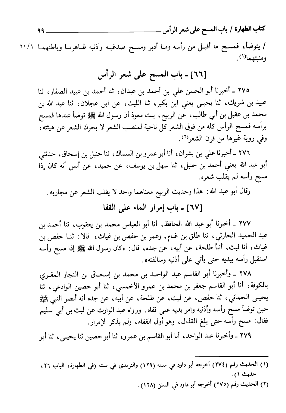 275 - أَخْبَرَنَا أَبُو الْحَسَنِ عَلِيُّ بْنُ أَحْمَدَ بْنِ عَبْدَانَ، ثنا أَحْمَدُ بْنُ عُبَيْدٍ الصَّفَّارُ، ثنا عُبَيْدُ بْنُ شَرِيكٍ، ثنا يَحْيَى يَعْنِي ابْنَ بُكَيْرٍ، ثنا اللَّيْثُ، عَنِ ابْنِ عَجْلَانَ، ثنا عَبْدُ اللهِ بْنُ مُحَمَّدِ بْنِ عَقِيلِ بْنِ أَبِي طَالِبٍ، عَنِ الرُّبَيِّعِ بِنْتِ مُعَوِّذٍ " أَنَّ رَسُولَ اللهِ صَلَّى اللهُ عَلَيْهِ وَسَلَّمَ تَوَضَّأَ عِنْدَهَا، §فَمَسَحَ بِرَأْسِهِ، فَمَسَحَ الرَّأْسَ كُلَّهُ مِنْ فَوْقِ الشَّعْرِ، كُلَّ نَاحِيَةٍ لِمُنْصَبِّ الشَّعْرِ لَا يُحَرِّكُ الشَّعْرَ عَنْ هَيْئَتِهِ ". وَفِي رِوَايَةٍ غَيْرِهَا مِنْ قَرْنِ الشَّعْرِ