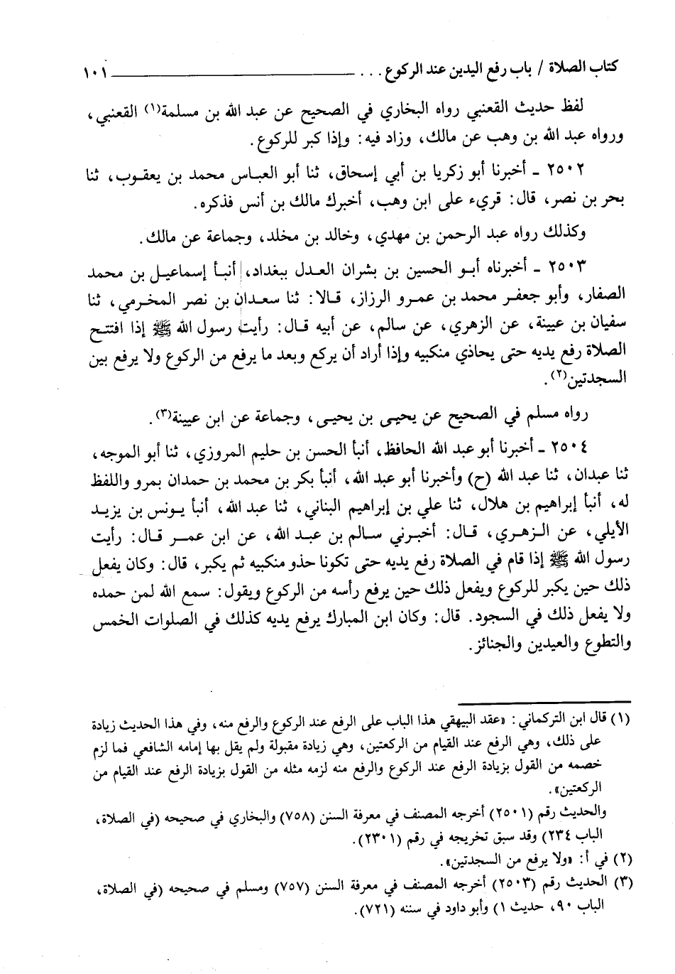 2503 - أَخْبَرَنَاهُ أَبُو الْحُسَيْنِ بْنُ بِشْرَانَ الْعَدْلُ بِبَغْدَادَ، أنبأ إِسْمَاعِيلُ بْنُ مُحَمَّدٍ الصَّفَّارُ، وَأَبُو جَعْفَرٍ مُحَمَّدُ بْنُ عَمْرٍو الرَّزَّازُ قَالَا: ثنا سَعْدَانُ بْنُ نَصْرٍ الْمُخَرِّمِيُّ، ثنا سُفْيَانُ بْنُ عُيَيْنَةَ، عَنِ الزُّهْرِيِّ، عَنْ سَالِمٍ، عَنْ أَبِيهِ قَالَ: رَأَيْتُ رَسُولَ اللهِ صَلَّى اللهُ عَلَيْهِ وَسَلَّمَ §" إِذَا افْتَتَحَ الصَّلَاةَ رَفَعَ يَدَيْهِ حَتَّى يُحَاذِيَ مَنْكِبَيْهِ وَإِذَا أَرَادَ أَنْ يَرْكَعَ، وَبَعْدَمَا يَرْفَعُ مِنَ الرُّكُوعِ وَلَا يَرْفَعُ بَيْنَ السَّجْدَتَيْنِ " رَوَاهُ مُسْلِمٌ فِي الصَّحِيحِ، عَنْ يَحْيَى بْنِ يَحْيَى، وَجَمَاعَةٌ عَنِ ابْنِ عُيَيْنَةَ