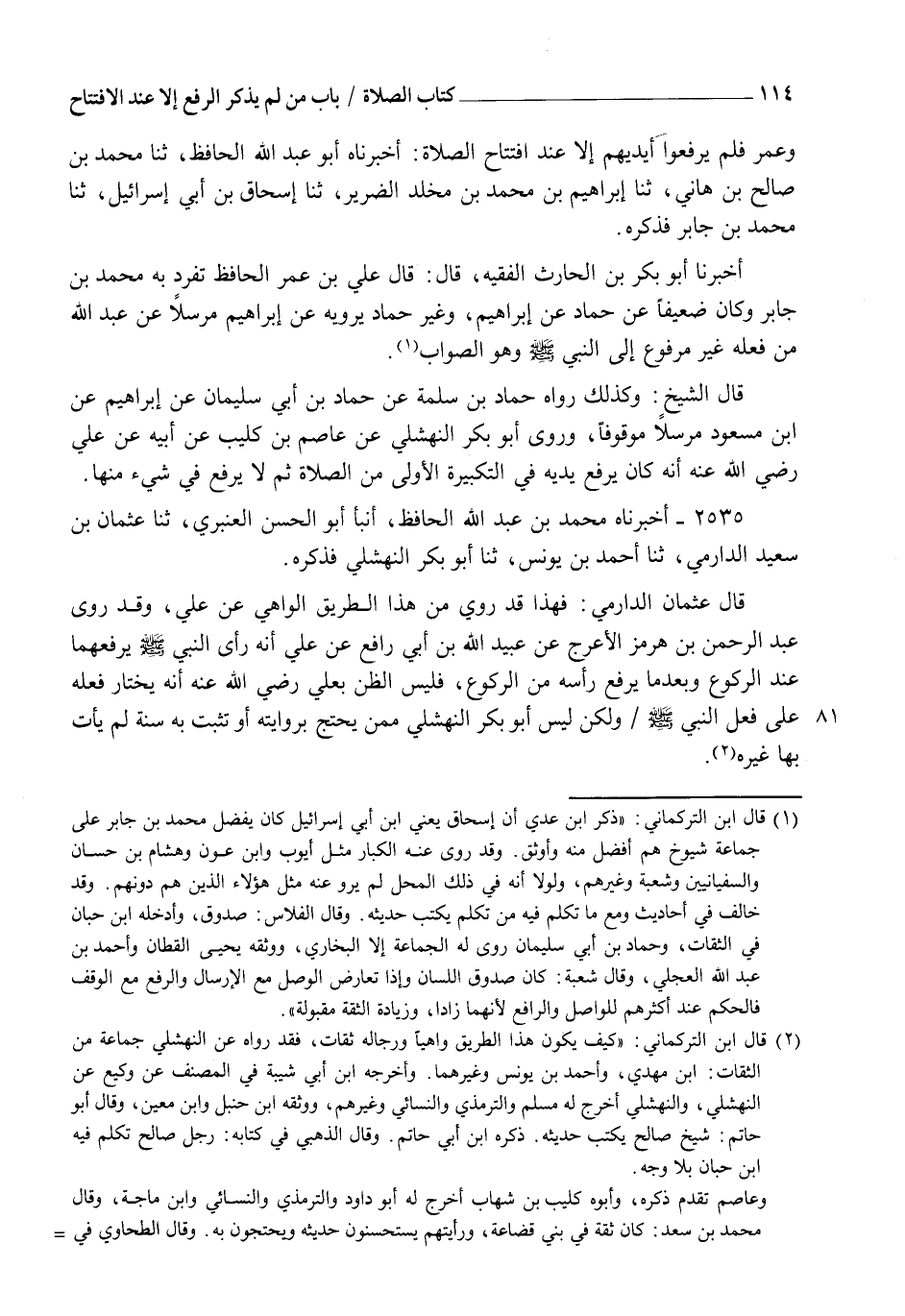 2535 - أَخْبَرَنَاهُ مُحَمَّدُ بْنُ عَبْدِ اللهِ الْحَافِظُ، أنبأ أَبُو الْحَسَنِ الْعَنْبَرِيُّ، ثنا عُثْمَانُ بْنُ سَعِيدٍ الدَّارِمِيُّ، ثنا أَحْمَدُ بْنُ يُونُسَ، ثنا أَبُو بَكْرٍ النَّهْشَلِيُّ، فَذَكَرَهُ قَالَ عُثْمَانُ الدَّارِمِيُّ: فَهَذَا قَدْ رُوِيَ مِنْ هَذَا الطَّرِيقِ الْوَاهِي، عَنْ عَلِيٍّ وَقَدْ رَوَى عَبْدُ الرَّحْمَنِ بْنُ هُرْمُزَ الْأَعْرَجُ، عَنْ عُبَيْدِ اللهِ بْنِ أَبِي رَافِعٍ، عَنْ عَلِيٍّ أَنَّهُ رَأَى النَّبِيَّ صَلَّى اللهُ عَلَيْهِ وَسَلَّمَ " يَرْفَعُهُمَا عِنْدَ الرُّكُوعِ وَبَعْدَمَا يَرْفَعُ رَأْسَهُ مِنَ الرُّكُوعِ " فَلَيْسَ الظَّنُّ بِعَلِيٍّ رَضِيَ اللهُ عَنْهُ أَنَّهُ يَخْتَارُ فِعْلَهُ عَلَى فِعْلِ النَّبِيِّ صَلَّى اللهُ عَلَيْهِ وَسَلَّمَ وَلَكِنْ لَيْسَ أَبُو بَكْرٍ النَّهْشَلِيُّ مِمَّنْ يُحْتَجُّ بِرِوَايَتِهِ أَوْ تَثْبُتُ بِهِ سُنَّةً لَمْ يَأْتِ بِهَا غَيْرُهُ -[115]- قَالَ الزَّعْفَرَانِيُّ قَالَ: الشَّافِعِيُّ فِي الْقَدِيمِ: وَلَا يَثْبُتُ عَنْ عَلِيٍّ وَابْنِ مَسْعُودٍ، يَعْنِي مَا رَوَوْهُ عَنْهُمَا مِنْ أَنَّهُمَا كَانَا لَا يَرْفَعَانِ أَيْدِيَهُمَا فِي شَيْءٍ مِنَ الصَّلَاةِ إِلَّا فِي تَكْبِيرَةِ الِافْتِتَاحِ. قَالَ الشَّافِعِيُّ رَحِمَهُ اللهُ: وَإِنَّمَا رَوَاهُ عَاصِمُ بْنُ كُلَيْبٍ، عَنْ أَبِيهِ، عَنْ عَلِيٍّ فَأَخَذَ بِهِ وَتَرَكَ مَا رَوَى عَاصِمٌ عَنْ أَبِيهِ، عَنْ وَائِلِ بْنِ حُجْرٍ أَنَّ النَّبِيَّ صَلَّى اللهُ عَلَيْهِ وَسَلَّمَ رَفَعَ يَدَيْهِ كَمَا رَوَى ابْنُ عُمَرَ، وَلَوْ كَانَ هَذَا ثَابِتًا عَنْ عَلِيٍّ وَعَبْدِ اللهِ كَانَ يُشْبِهُ أَنْ يَكُونَ رَآهُمَا مَرَّةً أَغْفَلَا فِيهِ رَفْعَ الْيَدَيْنِ وَلَوْ قَالَ قَائِلٌ: ذَهَبَ عَنْهُمَا حِفْظُ ذَلِكَ، عَنِ النَّبِيِّ صَلَّى اللهُ عَلَيْهِ وَسَلَّمَ وَحَفِظَهُ ابْنُ عُمَرَ، فَكَانَتْ لَهُ الْحُجَّةُ