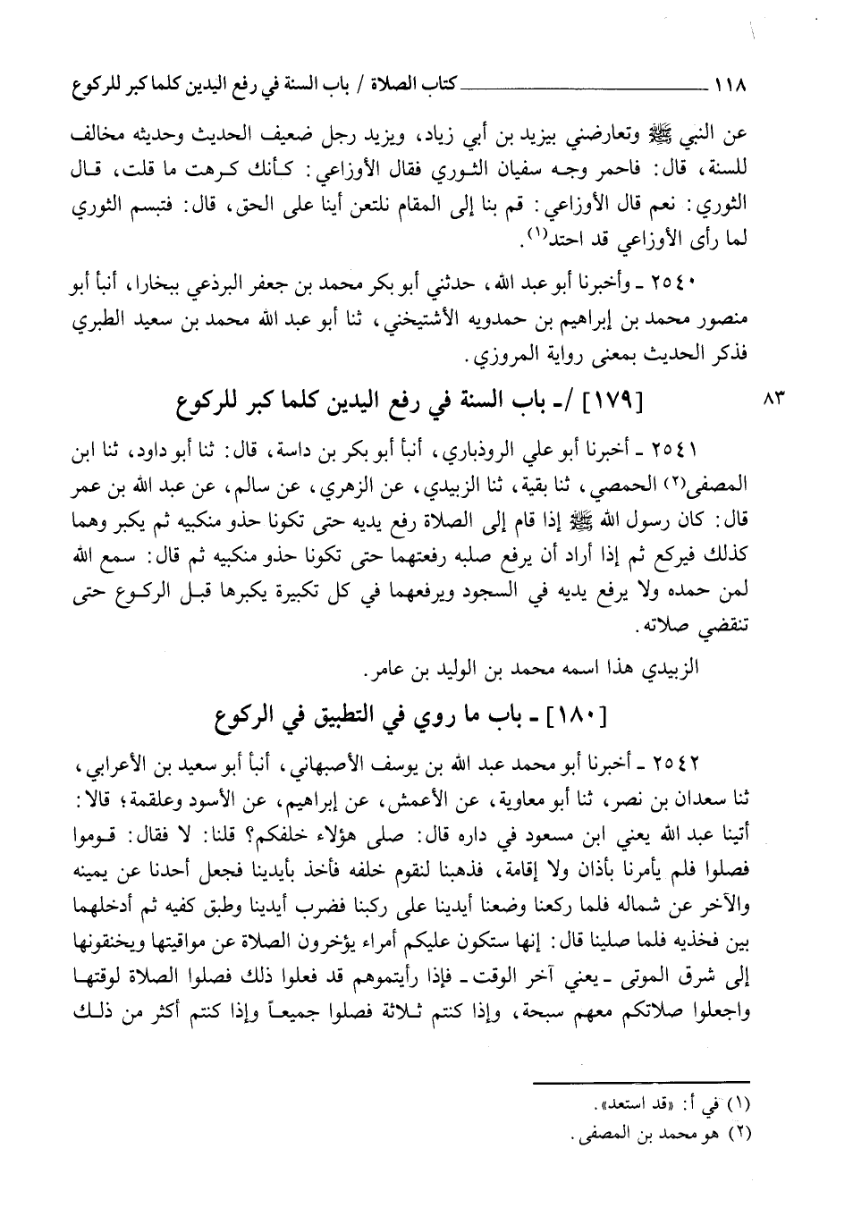2541 - أَخْبَرَنَا أَبُو عَلِيٍّ الرُّوذْبَارِيُّ، أنبأ أَبُو بَكْرِ بْنُ دَاسَةَ قَالَ: ثنا أَبُو دَاوُدَ، ثنا ابْنُ الْمُصَفَّى الْحِمْصِيُّ، ثنا بَقِيَّةُ، ثنا الزُّبَيْدِيُّ، عَنِ الزُّهْرِيِّ، عَنْ سَالِمٍ، عَنْ عَبْدِ اللهِ بْنِ عُمَرَ قَالَ: كَانَ رَسُولُ اللهِ صَلَّى اللهُ عَلَيْهِ وَسَلَّمَ §" إِذَا قَامَ إِلَى الصَّلَاةِ رَفَعَ يَدَيْهِ حَتَّى تَكُونَا حَذْوَ مَنْكِبَيْهِ، ثُمَّ يُكَبِّرُ وَهُمَا كَذَلِكَ فَيَرْكَعُ، ثُمَّ إِذَا أَرَادَ أَنْ يَرْفَعَ صُلْبَهُ رَفَعَهُمَا حَتَّى تَكُونَا حَذْوَ مَنْكِبَيْهِ، ثُمَّ قَالَ: سَمِعَ اللهُ لِمَنْ حَمِدَهُ، وَلَا يَرْفَعُ يَدَيْهِ فِي السُّجُودِ وَيَرْفَعُهُمَا فِي كُلِّ تَكْبِيرَةٍ يُكَبِّرُهَا قَبْلَ الرُّكُوعِ حَتَّى تَنْقَضِيَ صَلَاتُهُ " الزُّبَيْدِيُّ هَذَا اسْمُهُ مُحَمَّدُ بْنُ الْوَلِيدِ بْنِ عَامِرٍ