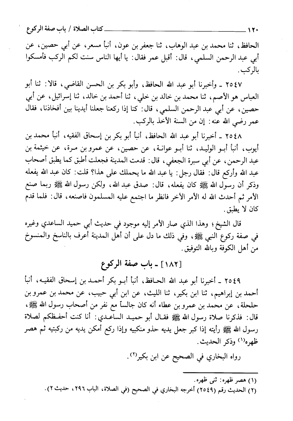 2548 - أَخْبَرَنَا أَبُو عَبْدِ اللهِ الْحَافِظُ، أنبأ أَبُو بَكْرِ بْنُ إِسْحَاقَ الْفَقِيهُ، أنبأ مُحَمَّدُ بْنُ أَيُّوبَ، أنبأ أَبُو الْوَلِيدِ، ثنا أَبُو عَوَانَةَ، عَنْ حُصَيْنٍ، عَنْ عَمْرِو بْنِ مُرَّةَ، عَنْ خَيْثَمَةَ بْنِ عَبْدِ الرَّحْمَنِ، عَنْ أَبِي سَبْرَةَ الْجُعْفِيِّ قَالَ: §" قَدِمْتُ الْمَدِينَةَ فَجَعَلْتُ أُطْبِقُ كَمَا يُطْبِقُ أَصْحَابُ عَبْدِ اللهِ وَأَرْكَعُ قَالَ: فَقَالَ رَجُلٌ: يَا عَبْدَ اللهِ مَا يَحْمِلُكَ عَلَى هَذَا؟ قُلْتُ: كَانَ عَبْدُ اللهِ يَفْعَلُهُ، وَذَكَرَ أَنَّ رَسُولَ اللهِ صَلَّى اللهُ عَلَيْهِ وَسَلَّمَ كَانَ يَفْعَلُهُ " قَالَ: صَدَقَ عَبْدُ اللهِ، وَلَكِنَّ رَسُولَ اللهِ صَلَّى اللهُ عَلَيْهِ وَسَلَّمَ رُبَّمَا صَنَعَ الْأَمْرَ، ثُمَّ أَحْدَثَ اللهُ لَهُ الْأَمْرَ الْآخَرَ، فَانْظُرْ مَا اجْتَمَعَ عَلَيْهِ الْمُسْلِمُونَ فَاصْنَعْهُ قَالَ: فَلَمَّا قَدِمَ كَانَ لَا يُطْبِقُ " قَالَ الشَّيْخُ: وَهَذَا الَّذِي صَارَ الْأَمْرُ إِلَيْهِ مَوْجُودٌ فِي حَدِيثِ أَبِي حُمَيْدٍ السَّاعِدِيِّ وَغَيْرِهِ فِي صِفَةِ رُكُوعِ النَّبِيِّ صَلَّى اللهُ عَلَيْهِ وَسَلَّمَ، وَفِي ذَلِكَ مَا دَلَّ عَلَى أَنَّ أَهْلَ الْمَدِينَةِ أَعْرَفُ بِالنَّاسِخِ وَالْمَنْسُوخِ مِنْ أَهْلِ الْكُوفَةِ، وَبِاللهِ التَّوْفِيقُ