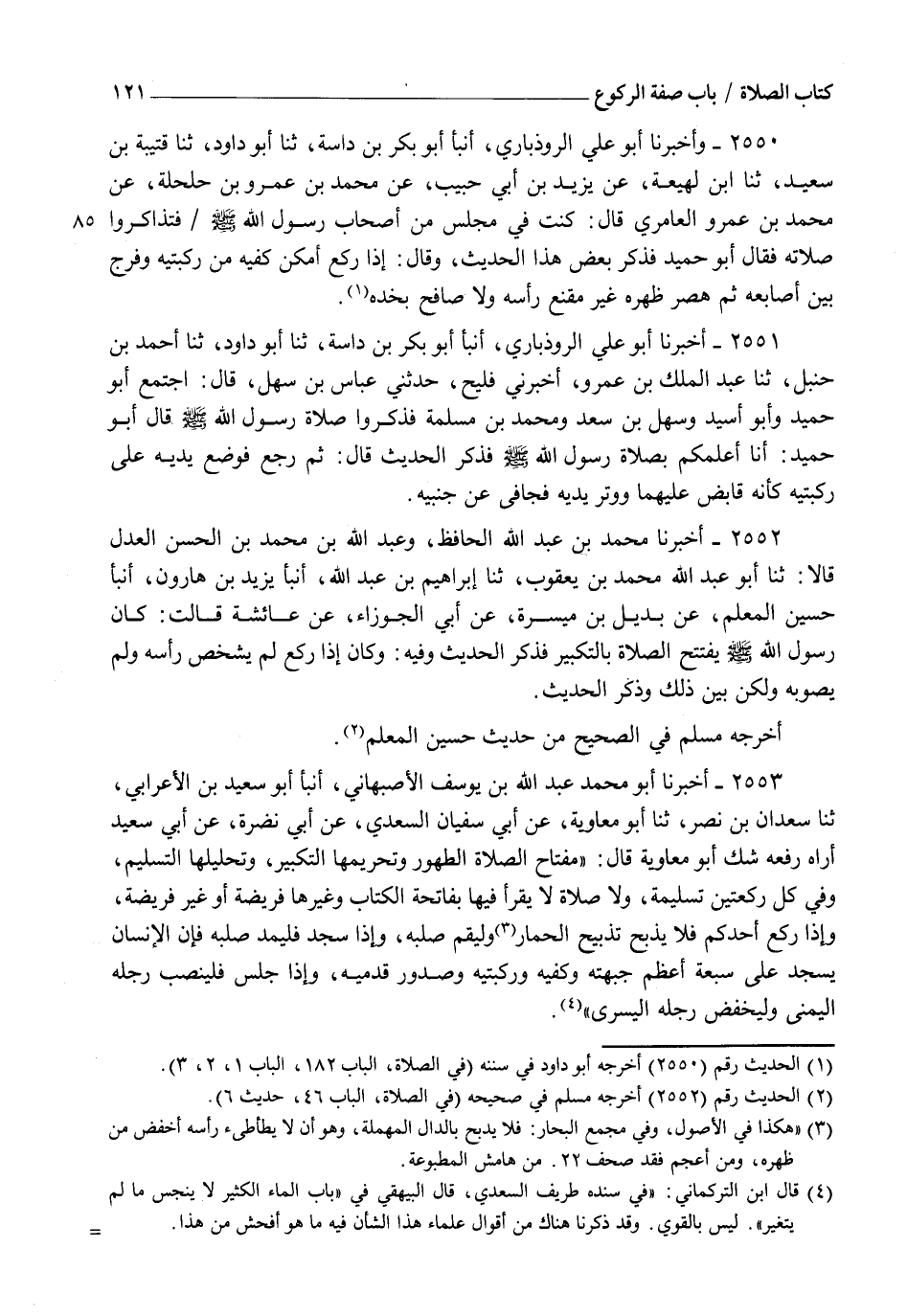 2551 - أَخْبَرَنَا أَبُو عَلِيٍّ الرُّوذْبَارِيُّ، أنبأ أَبُو بَكْرِ بْنُ دَاسَةَ، ثنا أَبُو دَاوُدَ، ثنا أَحْمَدُ بْنُ حَنْبَلٍ، ثنا عَبْدُ الْمَلِكِ بْنُ عَمْرٍو، أَخْبَرَنِي فُلَيْحٌ، حَدَّثَنِي عَبَّاسُ بْنُ سَهْلٍ قَالَ: اجْتَمَعَ أَبُو حُمَيْدٍ وَأَبُو أُسَيْدٍ وَسَهْلُ بْنُ سَعْدٍ وَمُحَمَّدُ بْنُ مَسْلَمَةَ، فَذَكَرُوا صَلَاةَ رَسُولِ اللهِ صَلَّى اللهُ عَلَيْهِ وَسَلَّمَ قَالَ أَبُو حُمَيْدٍ: أَنَا أَعْلَمُكُمْ بِصَلَاةِ رَسُولِ اللهِ صَلَّى اللهُ عَلَيْهِ وَسَلَّمَ فَذَكَرَ الْحَدِيثَ قَالَ: ثُمَّ رَجَعَ فَوَضَعَ يَدَيْهِ عَلَى رُكْبَتَيْهِ كَأَنَّهُ قَابِضٌ عَلَيْهِمَا وَوَتَّرَ يَدَيْهِ فَجَافَى عَنْ جَنْبَيْهِ