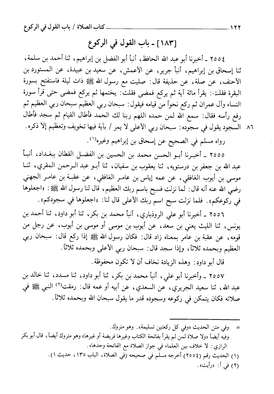 2554 - أَخْبَرَنَا أَبُو عَبْدِ اللهِ الْحَافِظُ، أنبأ أَبُو الْفَضْلِ بْنُ إِبْرَاهِيمَ، ثنا أَحْمَدُ بْنُ سَلَمَةَ، ثنا إِسْحَاقُ بْنُ إِبْرَاهِيمَ، أنبأ جَرِيرٌ، عَنِ الْأَعْمَشِ، عَنْ سَعِيدِ بْنِ عُبَيْدَةَ، عَنِ الْمُسْتَوْرِدِ بْنِ الْأَحْنَفِ، عَنْ صِلَةَ، عَنْ حُذَيْفَةَ قَالَ: §" صَلَّيْتُ مَعَ رَسُولِ اللهِ صَلَّى اللهُ عَلَيْهِ وَسَلَّمَ ذَاتَ لَيْلَةٍ فَاسْتَفْتَحَ بِسُورَةِ الْبَقَرَةِ، فَقُلْتُ يَقْرَأُ مِائَةَ آيَةٍ، ثُمَّ يَرْكَعُ فَمَضَى، فَقُلْتُ يَخْتِمُهَا، ثُمَّ يَرْكَعُ فَمَضَى حَتَّى قَرَأَ سُورَةَ النِّسَاءِ، وَآلَ عِمْرَانَ، ثُمَّ رَكَعَ نَحْوًا مِنْ قِيَامِهِ فَيَقُولُ سُبْحَانَ رَبِّيَ الْعَظِيمِ سُبْحَانَ رَبِّيَ الْعَظِيمِ، ثُمَّ رَفَعَ رَأْسَهُ " فَقَالَ: " سَمِعَ اللهُ لِمَنْ حَمِدَهُ اللهُمَّ رَبَّنَا لَكَ الْحَمْدُ " فَأَطَالَ الْقِيَامَ، ثُمَّ سَجَدَ فَأَطَالَ السُّجُودَ يَقُولُ: " فِي سُجُودِهِ سُبْحَانَ رَبِّيَ الْأَعْلَى " لَا يَمُرُّ بِآيَةٍ فِيهَا تَخْوِيفٌ وَتَعْظِيمٌ إِلَّا ذَكَرَهُ رَوَاهُ مُسْلِمٌ فِي الصَّحِيحِ، عَنْ إِسْحَاقَ بْنِ إِبْرَاهِيمَ وَغَيْرِهِ